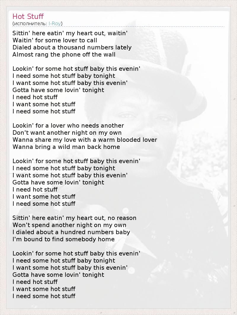 Sittin' here eatin' my heart out, waitin' Waitin' for some lover to call Dialed about a thousand numbers lately Almost rang the phone off the wall Lookin' for some hot stuff baby this evenin' I need some hot stuff baby tonight I want some hot stuff baby this evenin' Gotta have some lovin' tonight I need hot stuff I want some hot stuff I need some hot stuff Lookin' for a lover who needs another Don't want another night on my own Wanna share my love with a warm blooded lover Wanna bring a wild man back home Lookin' for some hot stuff baby this evenin' I need some hot stuff baby tonight I want some hot stuff baby this evenin' Gotta have some lovin' tonight I need hot stuff I want some hot stuff I need some hot stuff Sittin' here eatin' my heart out, no reason Won't spend another night on my own I dialed about a hundred numbers baby I'm bound to find somebody home Lookin' for some hot stuff baby this evenin' I need some hot stuff baby tonight I want some hot stuff baby this evenin' Gotta have some lovin' tonight I need hot stuff I want some hot stuff I need some hot stuff