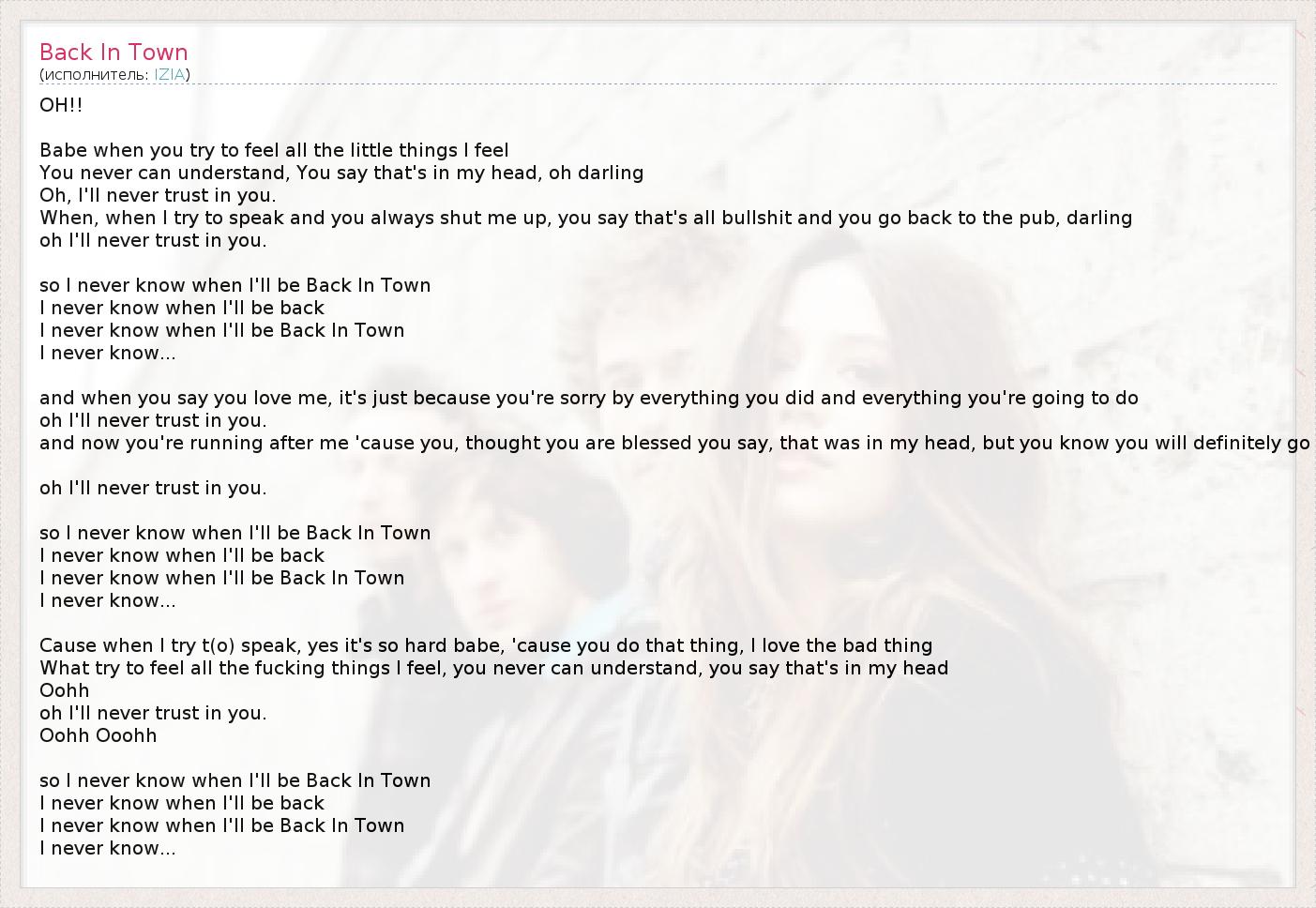 OH!! Babe when you try to feel all the little things I feel You never can understand, You say that's in my head, oh darling Oh, I'll never trust in you. When, when I try to speak and you always shut me up, you say that's all bullshit and you go back to the pub, darling oh I'll never trust in you. so I never know when I'll be Back In Town I never know when I'll be back I never know when I'll be Back In Town I never know... and when you say you love me, it's just because you're sorry by everything you did and everything you're going to do oh I'll never trust in you. and now you're running after me 'cause you, thought you are blessed you say, that was in my head, but you know you will definitely go oh I'll never trust in you. so I never know when I'll be Back In Town I never know when I'll be back I never know when I'll be Back In Town I never know... Cause when I try t(o) speak, yes it's so hard babe, 'cause you do that thing, I love the bad thing What try to feel all the fucking things I feel, you never can understand, you say that's in my head Oohh oh I'll never trust in you. Oohh Ooohh so I never know when I'll be Back In Town I never know when I'll be back I never know when I'll be Back In Town I never know...