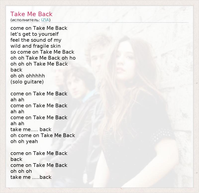 come on Take Me Back let's get to yourself feel the sound of my wild and fragile skin so come on Take Me Back oh oh Take Me Back oh ho oh oh oh Take Me Back back oh oh ohhhhh (solo guitare) come on Take Me Back ah ah come on Take Me Back ah ah come on Take Me Back ah ah take me..... back oh come on Take Me Back oh oh yeah come on Take Me Back back come on Take Me Back oh oh oh take me .....back