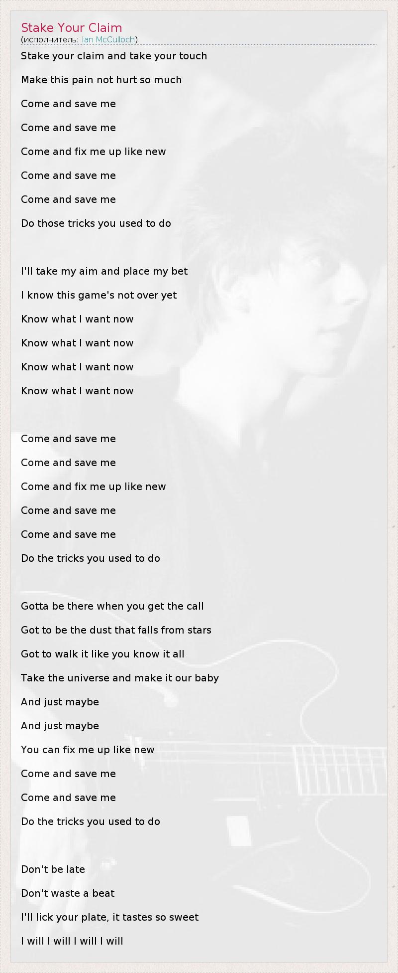 Stake your claim and take your touch Make this pain not hurt so much Come and save me Come and save me Come and fix me up like new Come and save me Come and save me Do those tricks you used to do I'll take my aim and place my bet I know this game's not over yet Know what I want now Know what I want now Know what I want now Know what I want now Come and save me Come and save me Come and fix me up like new Come and save me Come and save me Do the tricks you used to do Gotta be there when you get the call Got to be the dust that falls from stars Got to walk it like you know it all Take the universe and make it our baby And just maybe And just maybe You can fix me up like new Come and save me Come and save me Do the tricks you used to do Don't be late Don't waste a beat I'll lick your plate, it tastes so sweet I will I will I will I will