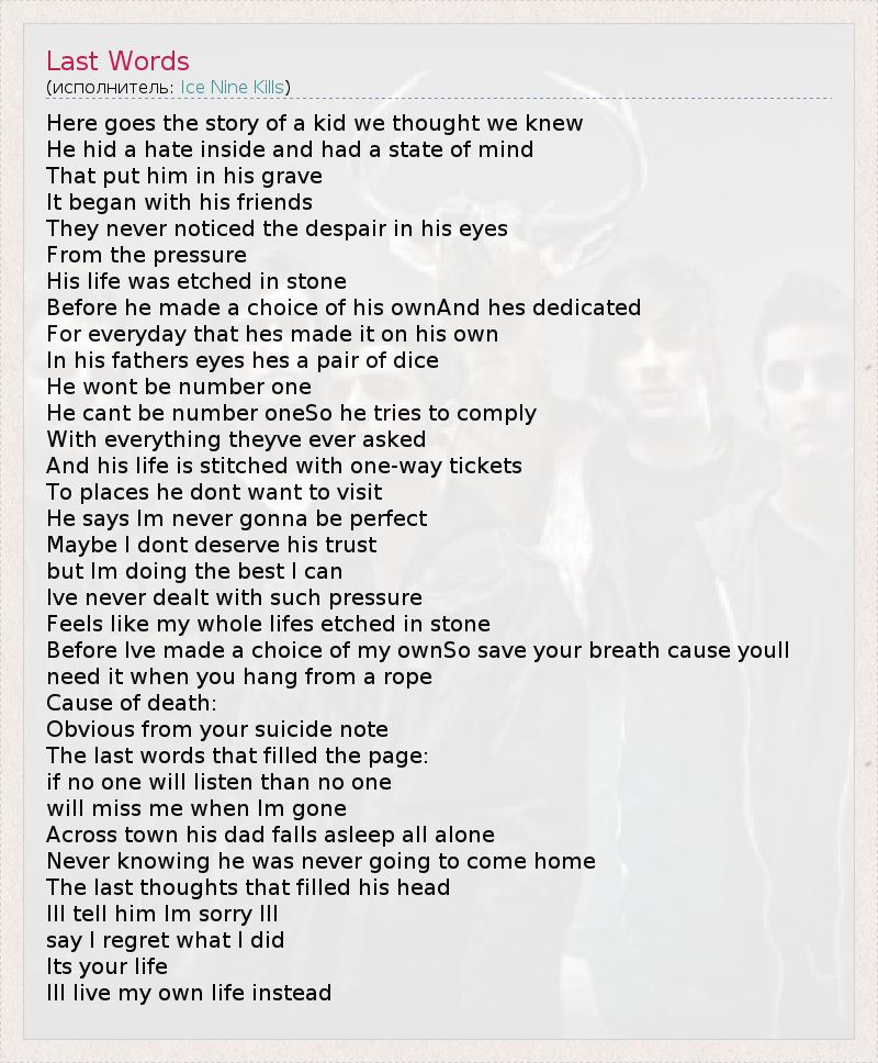 Here goes the story of a kid we thought we knew He hid a hate inside and had a state of mind That put him in his grave It began with his friends They never noticed the despair in his eyes From the pressure His life was etched in stone Before he made a choice of his ownAnd hes dedicated For everyday that hes made it on his own In his fathers eyes hes a pair of dice He wont be number one He cant be number oneSo he tries to comply With everything theyve ever asked And his life is stitched with one-way tickets To places he dont want to visit He says Im never gonna be perfect Maybe I dont deserve his trust but Im doing the best I can Ive never dealt with such pressure Feels like my whole lifes etched in stone Before Ive made a choice of my ownSo save your breath cause youll need it when you hang from a rope Cause of death: Obvious from your suicide note The last words that filled the page: if no one will listen than no one will miss me when Im gone Across town his dad falls asleep all alone Never knowing he was never going to come home The last thoughts that filled his head Ill tell him Im sorry Ill say I regret what I did Its your life Ill live my own life instead