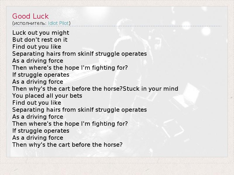 Luck out you might But don't rest on it Find out you like Separating hairs from skinIf struggle operates As a driving force Then where's the hope I'm fighting for? If struggle operates As a driving force Then why's the cart before the horse?Stuck in your mind You placed all your bets Find out you like Separating hairs from skinIf struggle operates As a driving force Then where's the hope I'm fighting for? If struggle operates As a driving force Then why's the cart before the horse?