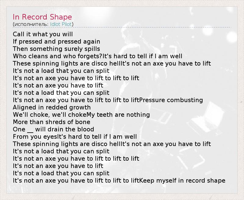 Call it what you will If pressed and pressed again Then something surely spills Who cleans and who forgets?It's hard to tell if I am well These spinning lights are disco hellIt's not an axe you have to lift It's not a load that you can split It's not an axe you have to lift to lift to lift It's not an axe you have to lift It's not a load that you can split It's not an axe you have to lift to lift to liftPressure combusting Aligned in redded growth We'll choke, we'll chokeMy teeth are nothing More than shreds of bone One __ will drain the blood From you eyesIt's hard to tell if I am well These spinning lights are disco hellIt's not an axe you have to lift It's not a load that you can split It's not an axe you have to lift to lift to lift It's not an axe you have to lift It's not a load that you can split It's not an axe you have to lift to lift to liftKeep myself in record shape