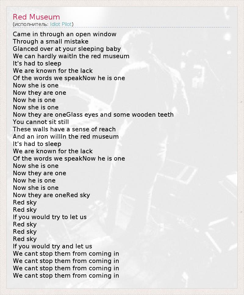 Came in through an open window Through a small mistake Glanced over at your sleeping baby We can hardly waitIn the red museum It's had to sleep We are known for the lack Of the words we speakNow he is one Now she is one Now they are one Now he is one Now she is one Now they are oneGlass eyes and some wooden teeth You cannot sit still These walls have a sense of reach And an iron willIn the red museum It's had to sleep We are known for the lack Of the words we speakNow he is one Now she is one Now they are one Now he is one Now she is one Now they are oneRed sky Red sky Red sky If you would try to let us Red sky Red sky Red sky If you would try and let us We cant stop them from coming in We cant stop them from coming in We cant stop them from coming in We cant stop them from coming in