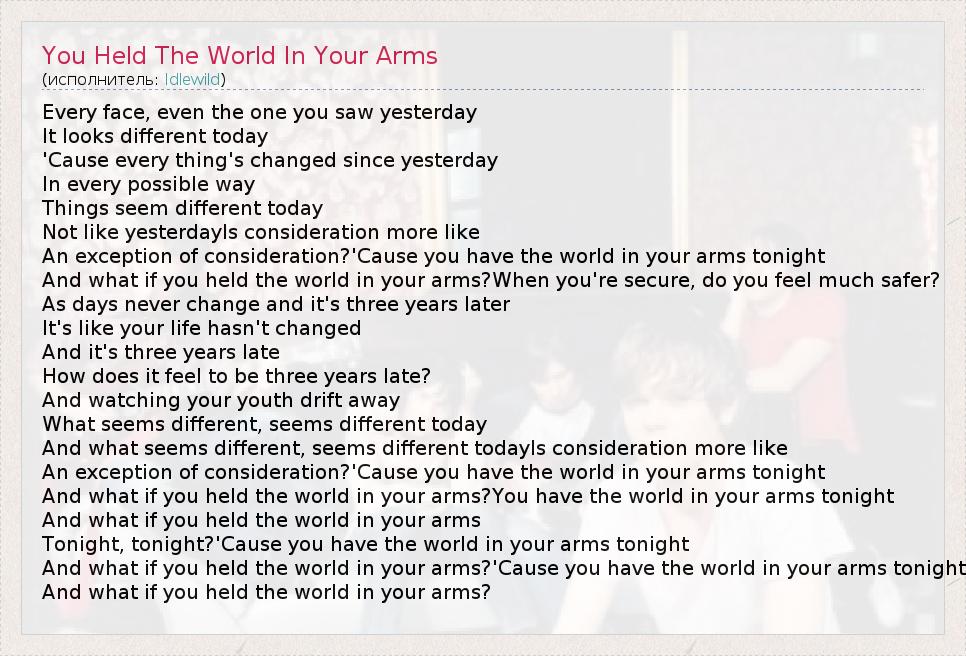 And what if you held the world in your arms?'Cause you have the world in your arms tonight