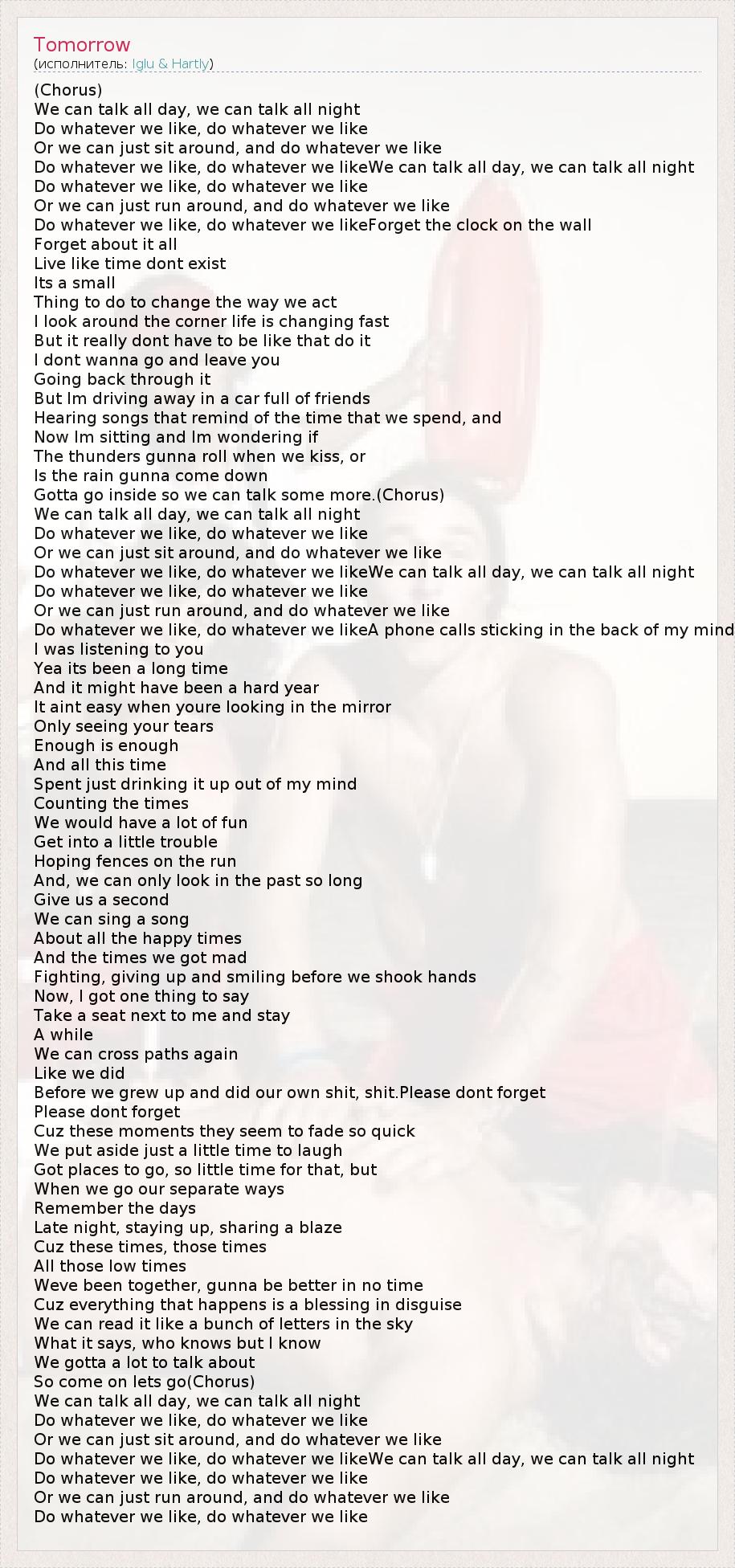 (Chorus) We can talk all day, we can talk all night Do whatever we like, do whatever we like Or we can just sit around, and do whatever we like Do whatever we like, do whatever we likeWe can talk all day, we can talk all night Do whatever we like, do whatever we like Or we can just run around, and do whatever we like Do whatever we like, do whatever we likeForget the clock on the wall Forget about it all Live like time dont exist Its a small Thing to do to change the way we act I look around the corner life is changing fast But it really dont have to be like that do it I dont wanna go and leave you Going back through it But Im driving away in a car full of friends Hearing songs that remind of the time that we spend, and Now Im sitting and Im wondering if The thunders gunna roll when we kiss, or Is the rain gunna come down Gotta go inside so we can talk some more.(Chorus) We can talk all day, we can talk all night Do whatever we like, do whatever we like Or we can just sit around, and do whatever we like Do whatever we like, do whatever we likeWe can talk all day, we can talk all night Do whatever we like, do whatever we like Or we can just run around, and do whatever we like Do whatever we like, do whatever we likeA phone calls sticking in the back of my mind I was listening to you Yea its been a long time And it might have been a hard year It aint easy when youre looking in the mirror Only seeing your tears Enough is enough And all this time Spent just drinking it up out of my mind Counting the times We would have a lot of fun Get into a little trouble Hoping fences on the run And, we can only look in the past so long Give us a second We can sing a song About all the happy times And the times we got mad Fighting, giving up and smiling before we shook hands Now, I got one thing to say Take a seat next to me and stay A while We can cross paths again Like we did Before we grew up and did our own shit, shit.Please dont forget Please dont forget Cuz these moments they seem to fade so quick We put aside just a little time to laugh Got places to go, so little time for that, but When we go our separate ways Remember the days Late night, staying up, sharing a blaze Cuz these times, those times All those low times Weve been together, gunna be better in no time Cuz everything that happens is a blessing in disguise We can read it like a bunch of letters in the sky What it says, who knows but I know We gotta a lot to talk about So come on lets go(Chorus) We can talk all day, we can talk all night Do whatever we like, do whatever we like Or we can just sit around, and do whatever we like Do whatever we like, do whatever we likeWe can talk all day, we can talk all night Do whatever we like, do whatever we like Or we can just run around, and do whatever we like Do whatever we like, do whatever we like