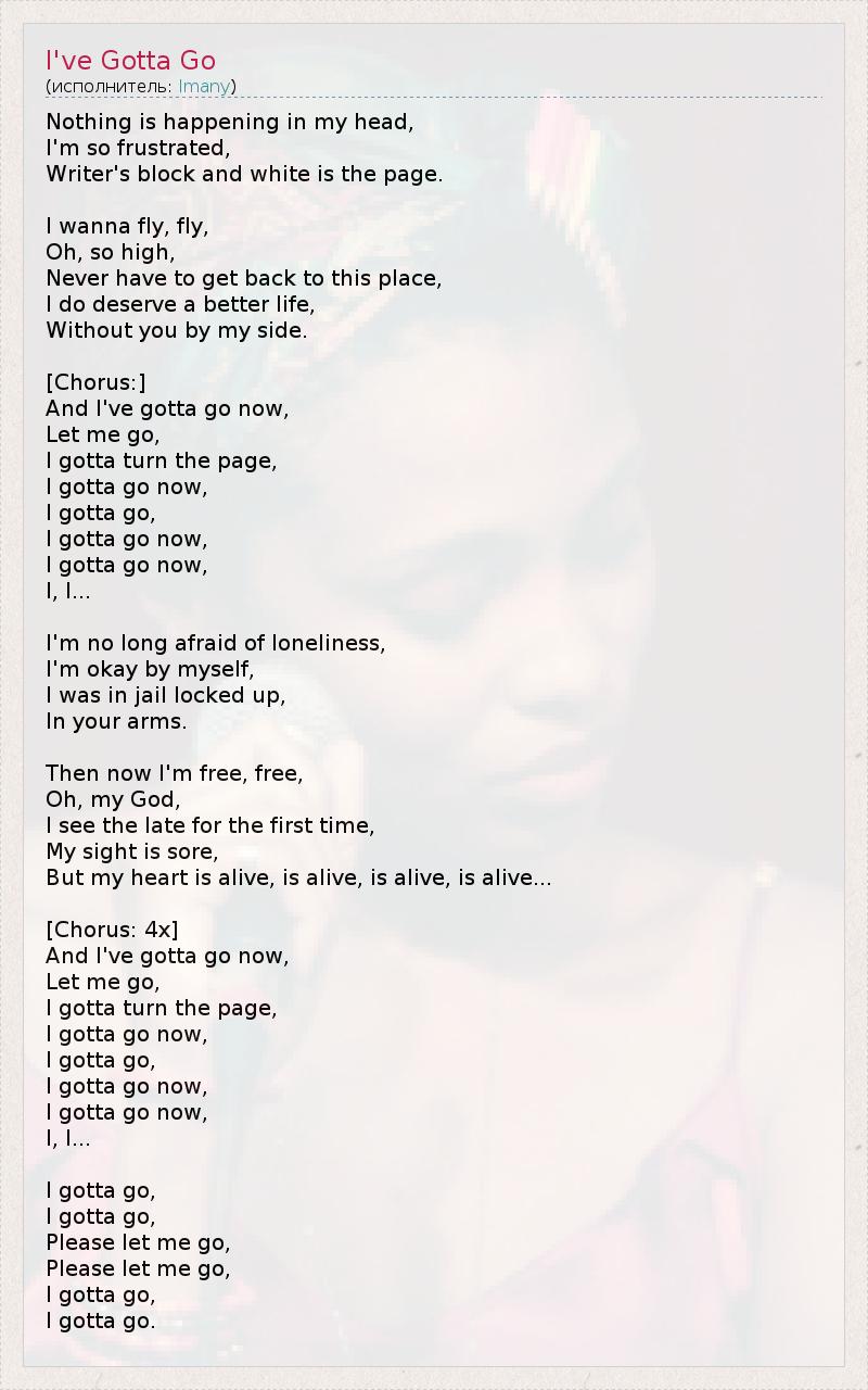 Nothing is happening in my head, I'm so frustrated, Writer's block and white is the page. I wanna fly, fly, Oh, so high, Never have to get back to this place, I do deserve a better life, Without you by my side. [Сhorus:] And I've gotta go now, Let me go, I gotta turn the page, I gotta go now, I gotta go, I gotta go now, I gotta go now, I, I... I'm no long afraid of loneliness, I'm okay by myself, I was in jail locked up, In your arms. Then now I'm free, free, Oh, my God, I see the late for the first time, My sight is sore, But my heart is alive, is alive, is alive, is alive... [Сhorus: 4x] And I've gotta go now, Let me go, I gotta turn the page, I gotta go now, I gotta go, I gotta go now, I gotta go now, I, I... I gotta go, I gotta go, Please let me go, Please let me go, I gotta go, I gotta go.