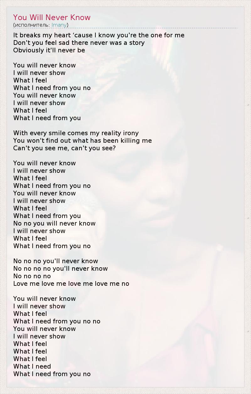 Понимание того, что ты - мой единственный, разбивает мне сердце... Не грустно ли тебе оттого, что ничего не сложилось? Очевидно, ничего и не будет... Ты никогда не узнаешь, Я никогда не покажу, Что я чувствую, Что мне нужно от тебя, нет... Ты никогда не узнаешь, Я никогда не покажу, Что я чувствую, Что мне нужно от тебя... С каждой улыбкой подступает мой сарказм. Ты не узнаешь, каково это - быть моим мучителем. Разве ты не замечаешь меня, ты не замечаешь? Ты никогда не узнаешь, Я никогда не покажу, Что я чувствую, Что мне нужно от тебя, нет... Ты никогда не узнаешь, Я никогда не покажу, Что я чувствую, Что мне нужно от тебя... Нет, нет, нет, нет, ты никогда не узнаешь, Я никогда не покажу, Что я чувствую, Что мне нужно от тебя, нет... Нет, нет, нет, ты никогда не узнаешь, Нет, нет, нет, нет, ты никогда не узнаешь, Нет, нет, нет, нет... Люби меня, люби меня, люби меня, люби меня, нет... Ты никогда не узнаешь, Я никогда не покажу, Что я чувствую, Что мне нужно от тебя, нет, нет... Ты никогда не узнаешь, Я никогда не покажу, Что я чувствую, Что я чувствую, Что я чувствую, Что мне нужно, Что мне нужно от тебя, нет...