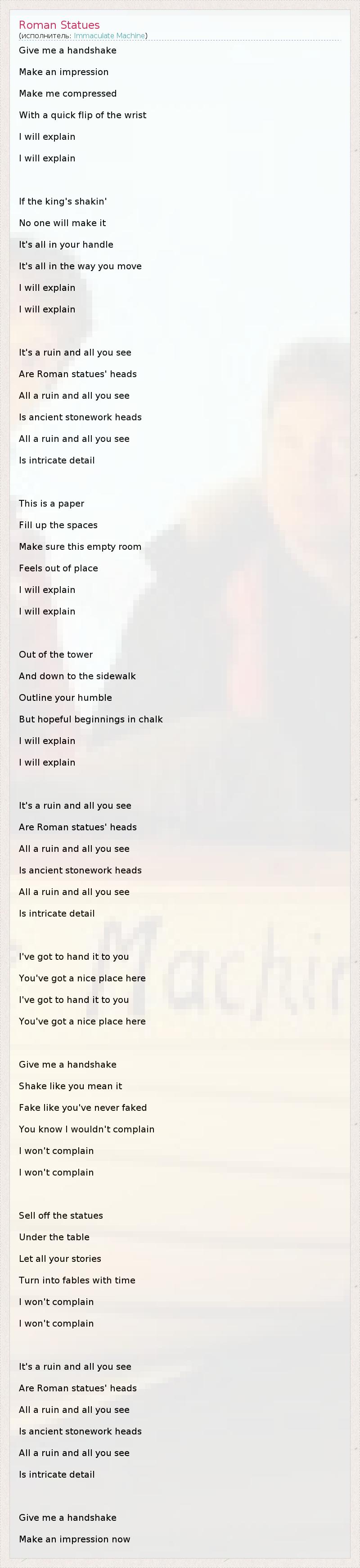 Give me a handshake Make an impression Make me compressed With a quick flip of the wrist I will explain I will explain If the king's shakin' No one will make it It's all in your handle It's all in the way you move I will explain I will explain It's a ruin and all you see Are Roman statues' heads All a ruin and all you see Is ancient stonework heads All a ruin and all you see Is intricate detail This is a paper Fill up the spaces Make sure this empty room Feels out of place I will explain I will explain Out of the tower And down to the sidewalk Outline your humble But hopeful beginnings in chalk I will explain I will explain It's a ruin and all you see Are Roman statues' heads All a ruin and all you see Is ancient stonework heads All a ruin and all you see Is intricate detail I've got to hand it to you You've got a nice place here I've got to hand it to you You've got a nice place here Give me a handshake Shake like you mean it Fake like you've never faked You know I wouldn't complain I won't complain I won't complain Sell off the statues Under the table Let all your stories Turn into fables with time I won't complain I won't complain It's a ruin and all you see Are Roman statues' heads All a ruin and all you see Is ancient stonework heads All a ruin and all you see Is intricate detail Give me a handshake Make an impression now