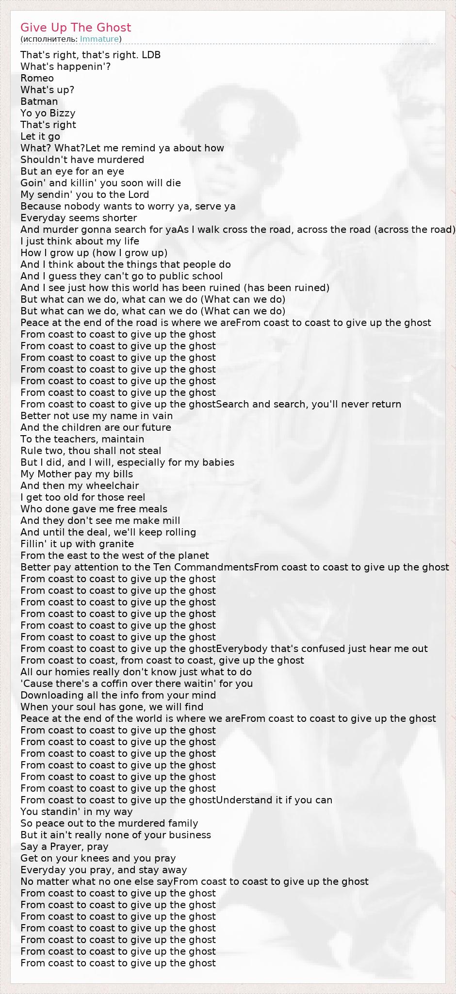 That's right, that's right. LDB What's happenin'? Romeo What's up? Batman Yo yo Bizzy That's right Let it go What? What?Let me remind ya about how Shouldn't have murdered But an eye for an eye Goin' and killin' you soon will die My sendin' you to the Lord Because nobody wants to worry ya, serve ya Everyday seems shorter And murder gonna search for yaAs I walk cross the road, across the road (across the road) I just think about my life How I grow up (how I grow up) And I think about the things that people do And I guess they can't go to public school And I see just how this world has been ruined (has been ruined) But what can we do, what can we do (What can we do) But what can we do, what can we do (What can we do) Peace at the end of the road is where we areFrom coast to coast to give up the ghost From coast to coast to give up the ghost From coast to coast to give up the ghost From coast to coast to give up the ghost From coast to coast to give up the ghost From coast to coast to give up the ghost From coast to coast to give up the ghost From coast to coast to give up the ghostSearch and search, you'll never return Better not use my name in vain And the children are our future To the teachers, maintain Rule two, thou shall not steal But I did, and I will, especially for my babies My Mother pay my bills And then my wheelchair I get too old for those reel Who done gave me free meals And they don't see me make mill And until the deal, we'll keep rolling Fillin' it up with granite From the east to the west of the planet Better pay attention to the Ten CommandmentsFrom coast to coast to give up the ghost From coast to coast to give up the ghost From coast to coast to give up the ghost From coast to coast to give up the ghost From coast to coast to give up the ghost From coast to coast to give up the ghost From coast to coast to give up the ghost From coast to coast to give up the ghostEverybody that's confused just hear me out From coast to coast, from coast to coast, give up the ghost All our homies really don't know just what to do 'Cause there's a coffin over there waitin' for you Downloading all the info from your mind When your soul has gone, we will find Peace at the end of the world is where we areFrom coast to coast to give up the ghost From coast to coast to give up the ghost From coast to coast to give up the ghost From coast to coast to give up the ghost From coast to coast to give up the ghost From coast to coast to give up the ghost From coast to coast to give up the ghost From coast to coast to give up the ghostUnderstand it if you can You standin' in my way So peace out to the murdered family But it ain't really none of your business Say a Prayer, pray Get on your knees and you pray Everyday you pray, and stay away No matter what no one else sayFrom coast to coast to give up the ghost From coast to coast to give up the ghost From coast to coast to give up the ghost From coast to coast to give up the ghost From coast to coast to give up the ghost From coast to coast to give up the ghost From coast to coast to give up the ghost From coast to coast to give up the ghost