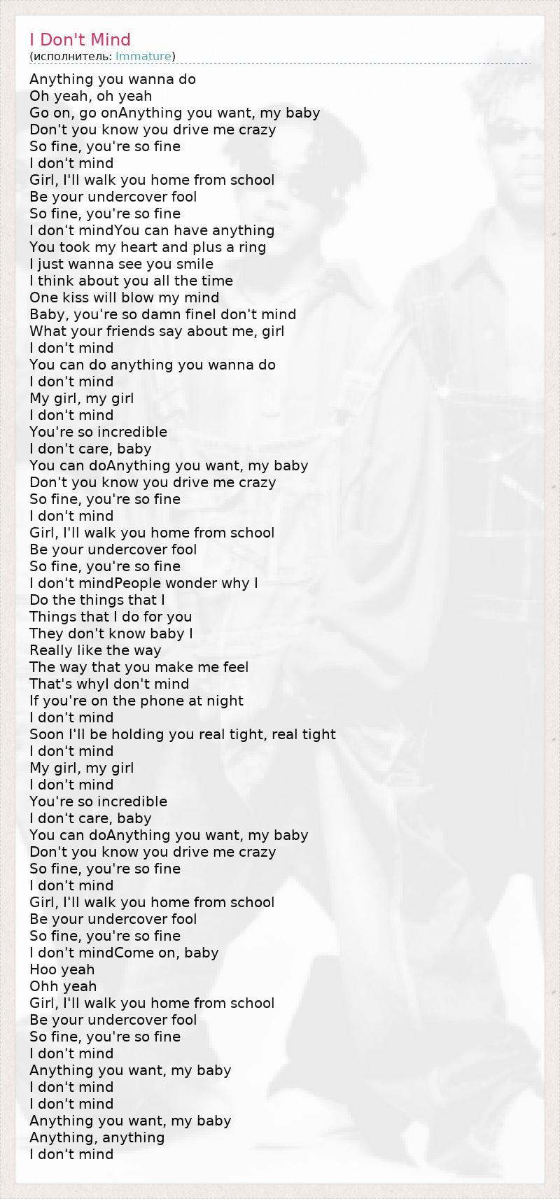 Anything you wanna do Oh yeah, oh yeah Go on, go onAnything you want, my baby Don't you know you drive me crazy So fine, you're so fine I don't mind Girl, I'll walk you home from school Be your undercover fool So fine, you're so fine I don't mindYou can have anything You took my heart and plus a ring I just wanna see you smile I think about you all the time One kiss will blow my mind Baby, you're so damn fineI don't mind What your friends say about me, girl I don't mind You can do anything you wanna do I don't mind My girl, my girl I don't mind You're so incredible I don't care, baby You can doAnything you want, my baby Don't you know you drive me crazy So fine, you're so fine I don't mind Girl, I'll walk you home from school Be your undercover fool So fine, you're so fine I don't mindPeople wonder why I Do the things that I Things that I do for you They don't know baby I Really like the way The way that you make me feel That's whyI don't mind If you're on the phone at night I don't mind Soon I'll be holding you real tight, real tight I don't mind My girl, my girl I don't mind You're so incredible I don't care, baby You can doAnything you want, my baby Don't you know you drive me crazy So fine, you're so fine I don't mind Girl, I'll walk you home from school Be your undercover fool So fine, you're so fine I don't mindCome on, baby Hoo yeah Ohh yeah Girl, I'll walk you home from school Be your undercover fool So fine, you're so fine I don't mind Anything you want, my baby I don't mind I don't mind Anything you want, my baby Anything, anything I don't mind