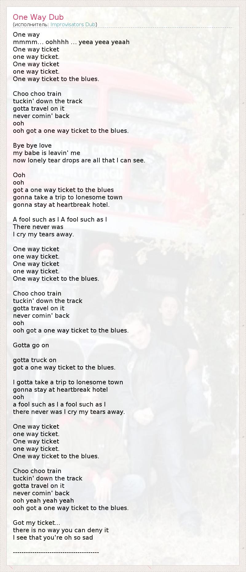One way mmmm… oohhhh … yeea yeea yeaah One way ticket one way ticket. One way ticket one way ticket. One way ticket to the blues. Choo choo train tuckin' down the track gotta travel on it never comin' back ooh ooh got a one way ticket to the blues. Bye bye love my babe is leavin' me now lonely tear drops are all that I can see. Ooh ooh got a one way ticket to the blues gonna take a trip to lonesome town gonna stay at heartbreak hotel. A fool such as I A fool such as I There never was I cry my tears away. One way ticket one way ticket. One way ticket one way ticket. One way ticket to the blues. Choo choo train tuckin' down the track gotta travel on it never comin' back ooh ooh got a one way ticket to the blues. Gotta go on gotta truck on got a one way ticket to the blues. I gotta take a trip to lonesome town gonna stay at heartbreak hotel ooh a fool such as I a fool such as I there never was I cry my tears away. One way ticket one way ticket. One way ticket one way ticket. One way ticket to the blues. Choo choo train tuckin' down the track gotta travel on it never comin' back ooh yeah yeah yeah ooh got a one way ticket to the blues. Got my ticket... there is no way you can deny it I see that you're oh so sad ----------------------------------------