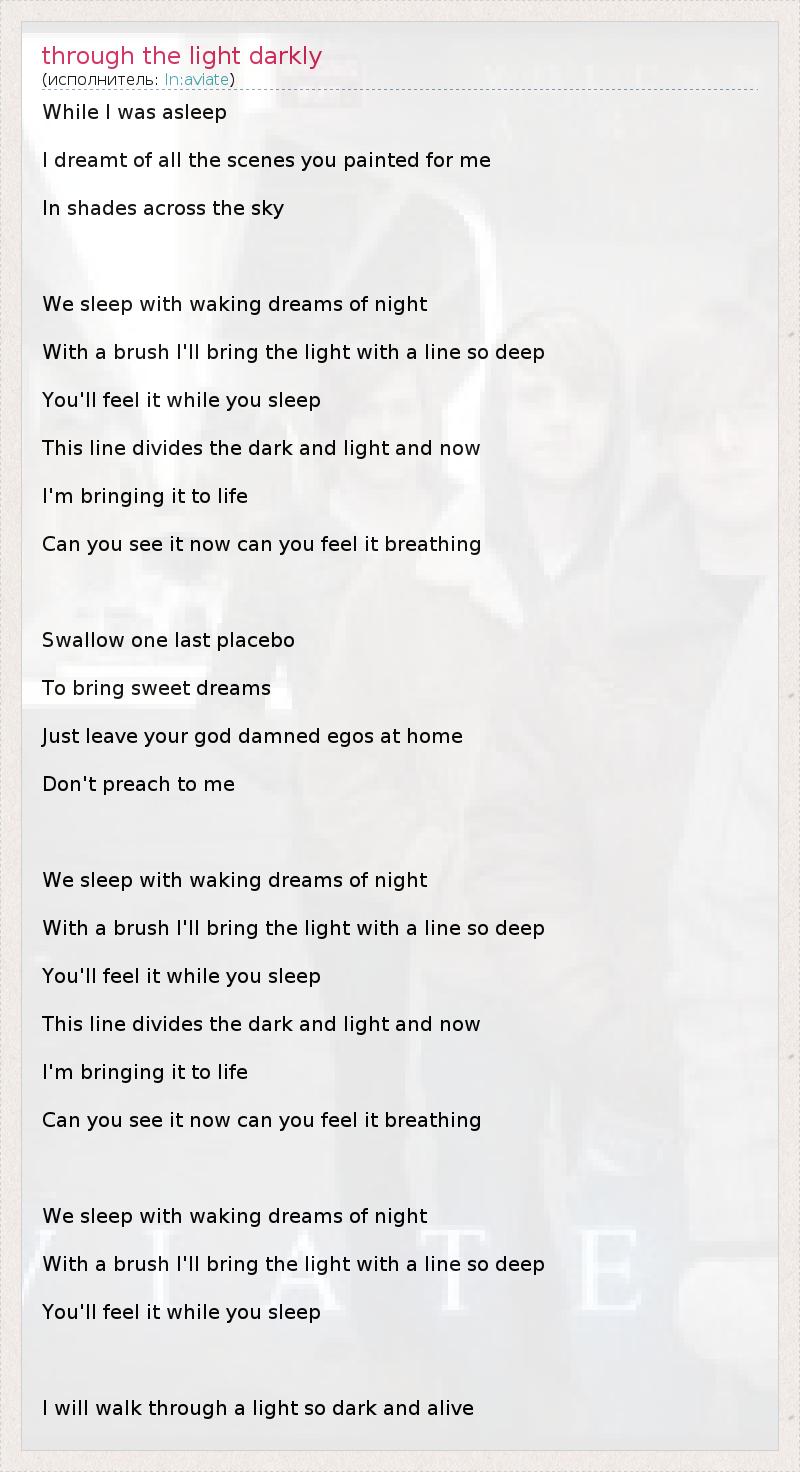 While I was asleep I dreamt of all the scenes you painted for me In shades across the sky We sleep with waking dreams of night With a brush I'll bring the light with a line so deep You'll feel it while you sleep This line divides the dark and light and now I'm bringing it to life Can you see it now can you feel it breathing Swallow one last placebo To bring sweet dreams Just leave your god damned egos at home Don't preach to me We sleep with waking dreams of night With a brush I'll bring the light with a line so deep You'll feel it while you sleep This line divides the dark and light and now I'm bringing it to life Can you see it now can you feel it breathing We sleep with waking dreams of night With a brush I'll bring the light with a line so deep You'll feel it while you sleep I will walk through a light so dark and alive
