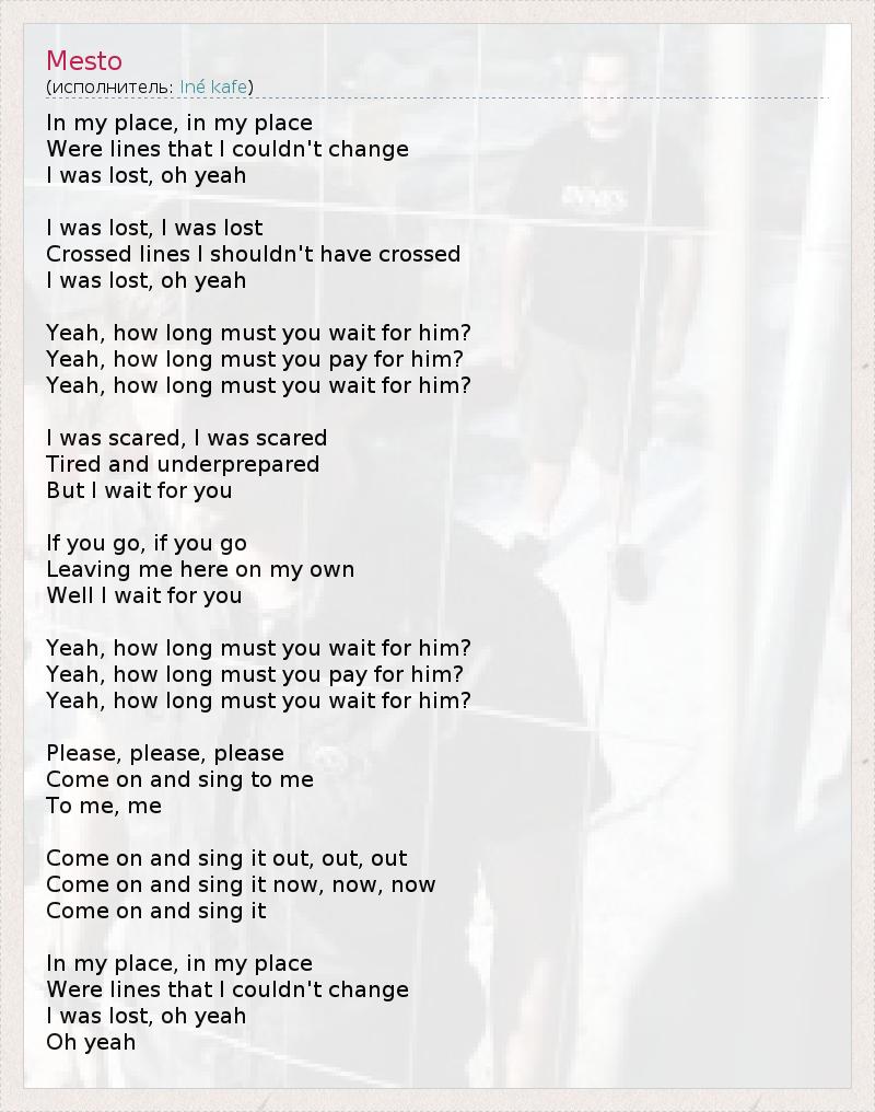 In my place, in my place Were lines that I couldn't change I was lost, oh yeah I was lost, I was lost Crossed lines I shouldn't have crossed I was lost, oh yeah Yeah, how long must you wait for him? Yeah, how long must you pay for him? Yeah, how long must you wait for him? I was scared, I was scared Tired and underprepared But I wait for you If you go, if you go Leaving me here on my own Well I wait for you Yeah, how long must you wait for him? Yeah, how long must you pay for him? Yeah, how long must you wait for him? Please, please, please Come on and sing to me To me, me Come on and sing it out, out, out Come on and sing it now, now, now Come on and sing it In my place, in my place Were lines that I couldn't change I was lost, oh yeah Oh yeah