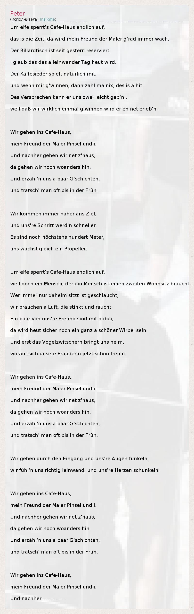 Um elfe sperrt's Cafe-Haus endlich auf, das is die Zeit, da wird mein Freund der Maler g'rad immer wach. Der Billardtisch ist seit gestern reserviert, i glaub das des a leinwander Tag heut wird. Der Kaffesieder spielt natürlich mit, und wenn mir g'winnen, dann zahl ma nix, des is a hit. Des Versprechen kann er uns zwei leicht geb'n., weil daß wir wirklich einmal g'winnen wird er eh net erleb'n. Wir gehen ins Cafe-Haus, mein Freund der Maler Pinsel und i. Und nachher gehen wir net z'haus, da gehen wir noch woanders hin. Und erzähl'n uns a paar G'schichten, und tratsch' man oft bis in der Früh. Wir kommen immer näher ans Ziel, und uns're Schritt werd'n schneller. Es sind noch höchstens hundert Meter, uns wächst gleich ein Propeller. Um elfe sperrt's Cafe-Haus endlich auf, weil doch ein Mensch, der ein Mensch ist einen zweiten Wohnsitz braucht. Wer immer nur daheim sitzt ist geschlaucht, wir brauchen a Luft, die stinkt und raucht. Ein paar von uns're Freund sind mit dabei, da wird heut sicher noch ein ganz a schöner Wirbel sein. Und erst das Vogelzwitschern bringt uns heim, worauf sich unsere Frauderln jetzt schon freu'n. Wir gehen ins Cafe-Haus, mein Freund der Maler Pinsel und i. Und nachher gehen wir net z'haus, da gehen wir noch woanders hin. Und erzähl'n uns a paar G'schichten, und tratsch' man oft bis in der Früh. Wir gehen durch den Eingang und uns're Augen funkeln, wir fühl'n uns richtig leinwand, und uns're Herzen schunkeln. Wir gehen ins Cafe-Haus, mein Freund der Maler Pinsel und i. Und nachher gehen wir net z'haus, da gehen wir noch woanders hin. Und erzähl'n uns a paar G'schichten, und tratsch' man oft bis in der Früh. Wir gehen ins Cafe-Haus, mein Freund der Maler Pinsel und i. Und nachher ...............