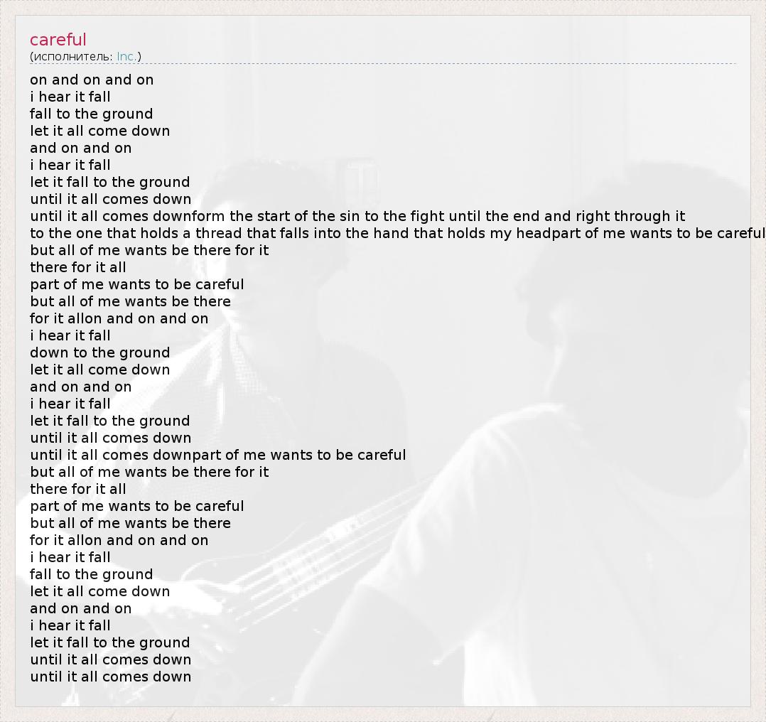 on and on and on i hear it fall fall to the ground let it all come down and on and on i hear it fall let it fall to the ground until it all comes down until it all comes downform the start of the sin to the fight until the end and right through it to the one that holds a thread that falls into the hand that holds my headpart of me wants to be careful but all of me wants be there for it there for it all part of me wants to be careful but all of me wants be there for it allon and on and on i hear it fall down to the ground let it all come down and on and on i hear it fall let it fall to the ground until it all comes down until it all comes downpart of me wants to be careful but all of me wants be there for it there for it all part of me wants to be careful but all of me wants be there for it allon and on and on i hear it fall fall to the ground let it all come down and on and on i hear it fall let it fall to the ground until it all comes down until it all comes down