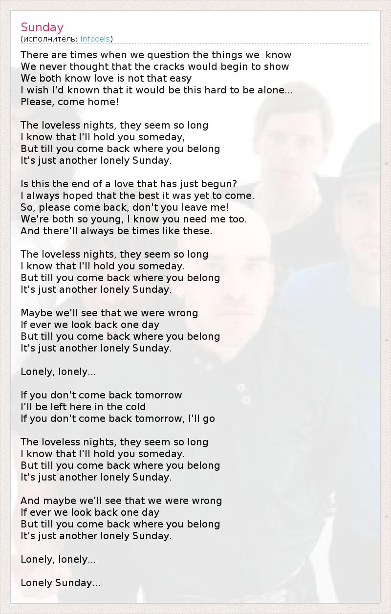 Порой мы сомневаемся даже в том, что знаем наверняка, Мы и не подозревали, что когда-нибудь все может пойти по швам, Нам известно, что любить – не так-то просто, Но жаль, что я не понимал, как трудно быть одному... Прошу, вернись!!! Ночи без любви кажутся невыносимо длинными, Знаю, что обниму тебя однажды, Но пока ты не вернулась туда, где я жду тебя, Это всего лишь еще одно одинокое воскресенье. И неужели любовь кончится вот так, едва начавшись? Я всегда надеялся, что самое лучшее у нас впереди. Так прошу, вернись, только не оставляй меня! Мы так молоды, я знаю, что нужен тебе тоже. А периоды, похожие на этот, будут всегда... Без тебя ночи нестерпимо бесконечны, Конечно, однажды ты будешь моей, Но пока ты не вернулась туда, откуда ушла, Я снова задыхаюсь от одиночества в тоскливое воскресенье. Возможно, мы поймем, что были не правы, Если когда-нибудь оглянемся назад, Но пока ты не поймешь, что ты – часть меня, Я так и буду встречать воскресенье в одиночестве. Одинокое, одинокое... Если ты не вернешься завтра, Холод овладеет моим сердцем, Если ты не вернешься завтра, я уйду... Когда тебя нет, ночи мучительно тянутся веками, Да, когда-нибудь я обниму тебя, Но пока ты не вернулась туда, где ты должна быть, Снова воскресение...и одиночество стучится в мою дверь. И может быть, мы поймем, что были не правы, Если когда-нибудь оглянемся назад, Но пока ты не вернулась, туда где я тебя жду, Я снова впущу к себе воскресное одиночество. Одинокое, одинокое... Одинокое воскресенье...