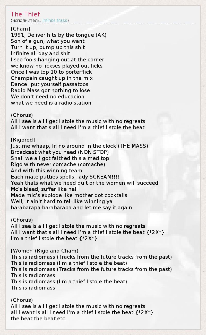 all I want is all I need I'm a thief I stole the beat {*2X*}