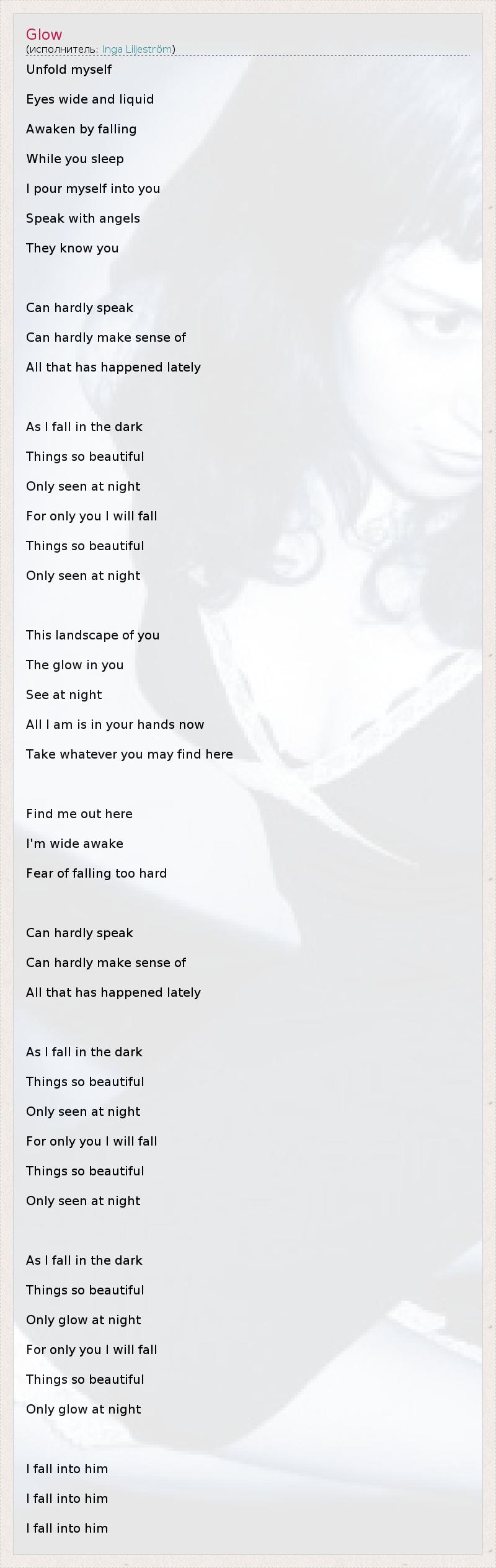 Unfold myself Eyes wide and liquid Awaken by falling While you sleep I pour myself into you Speak with angels They know you Can hardly speak Can hardly make sense of All that has happened lately As I fall in the dark Things so beautiful Only seen at night For only you I will fall Things so beautiful Only seen at night This landscape of you The glow in you See at night All I am is in your hands now Take whatever you may find here Find me out here I'm wide awake Fear of falling too hard Can hardly speak Can hardly make sense of All that has happened lately As I fall in the dark Things so beautiful Only seen at night For only you I will fall Things so beautiful Only seen at night As I fall in the dark Things so beautiful Only glow at night For only you I will fall Things so beautiful Only glow at night I fall into him I fall into him I fall into him