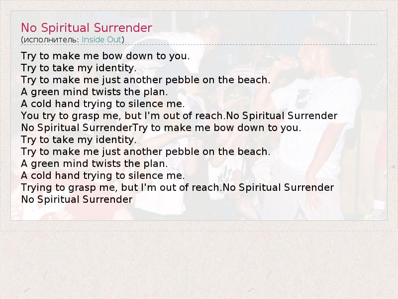 А как ты думаешь, о чем песня "No Spiritual Surrender" ?