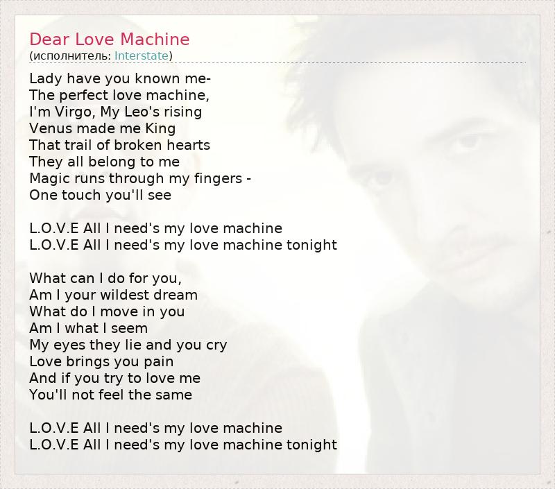 Lady have you known me- The perfect love machine, I'm Virgo, My Leo's rising Venus made me King That trail of broken hearts They all belong to me Magic runs through my fingers - One touch you'll see L.O.V.E All I need's my love machine L.O.V.E All I need's my love machine tonight What can I do for you, Am I your wildest dream What do I move in you Am I what I seem My eyes they lie and you cry Love brings you pain And if you try to love me You'll not feel the same L.O.V.E All I need's my love machine L.O.V.E All I need's my love machine tonight