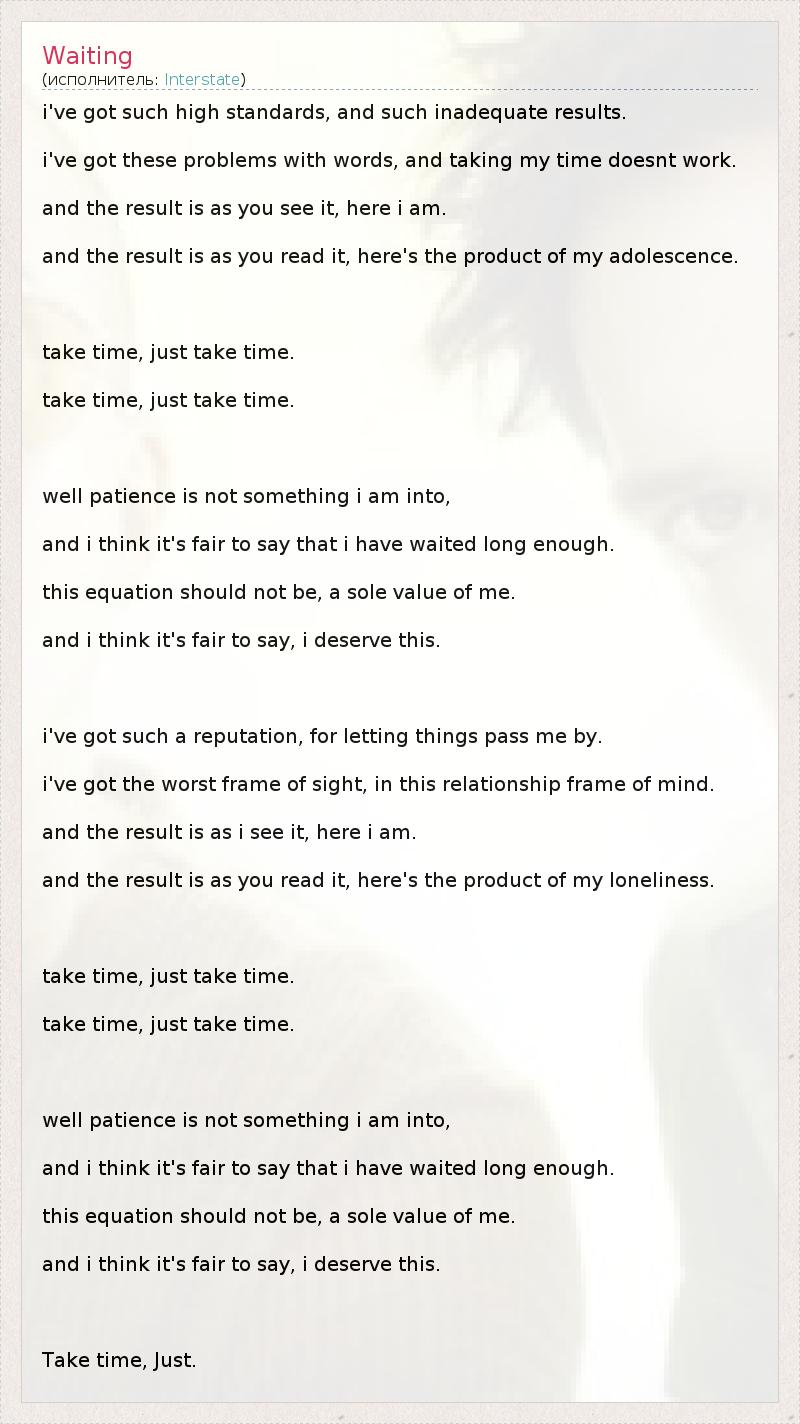 i've got such high standards, and such inadequate results. i've got these problems with words, and taking my time doesnt work. and the result is as you see it, here i am. and the result is as you read it, here's the product of my adolescence. take time, just take time. take time, just take time. well patience is not something i am into, and i think it's fair to say that i have waited long enough. this equation should not be, a sole value of me. and i think it's fair to say, i deserve this. i've got such a reputation, for letting things pass me by. i've got the worst frame of sight, in this relationship frame of mind. and the result is as i see it, here i am. and the result is as you read it, here's the product of my loneliness. take time, just take time. take time, just take time. well patience is not something i am into, and i think it's fair to say that i have waited long enough. this equation should not be, a sole value of me. and i think it's fair to say, i deserve this. Take time, Just.