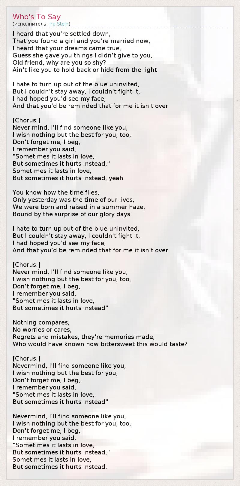I heard that you're settled down, That you found a girl and you're married now, I heard that your dreams came true, Guess she gave you things I didn't give to you, Old friend, why are you so shy? Ain't like you to hold back or hide from the light I hate to turn up out of the blue uninvited, But I couldn't stay away, I couldn't fight it, I had hoped you'd see my face, And that you'd be reminded that for me it isn't over [Chorus:] Never mind, I'll find someone like you, I wish nothing but the best for you, too, Don't forget me, I beg, I remember you said, "Sometimes it lasts in love, But sometimes it hurts instead," Sometimes it lasts in love, But sometimes it hurts instead, yeah You know how the time flies, Only yesterday was the time of our lives, We were born and raised in a summer haze, Bound by the surprise of our glory days I hate to turn up out of the blue uninvited, But I couldn't stay away, I couldn't fight it, I had hoped you'd see my face, And that you'd be reminded that for me it isn't over [Chorus:] Never mind, I'll find someone like you, I wish nothing but the best for you, too, Don't forget me, I beg, I remember you said, "Sometimes it lasts in love, But sometimes it hurts instead" Nothing compares, No worries or cares, Regrets and mistakes, they're memories made, Who would have known how bittersweet this would taste? [Chorus:] Nevermind, I'll find someone like you, I wish nothing but the best for you, Don't forget me, I beg, I remember you said, "Sometimes it lasts in love, But sometimes it hurts instead" Nevermind, I'll find someone like you, I wish nothing but the best for you, too, Don't forget me, I beg, I remember you said, "Sometimes it lasts in love, But sometimes it hurts instead," Sometimes it lasts in love, But sometimes it hurts instead.