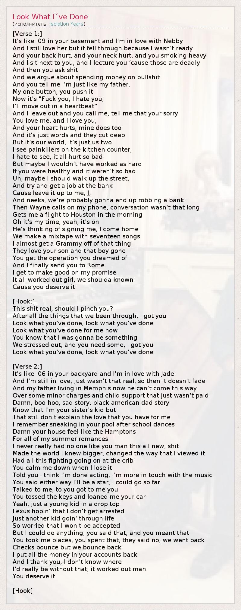 А как ты думаешь, о чем песня "Look What I´ve Done" ?