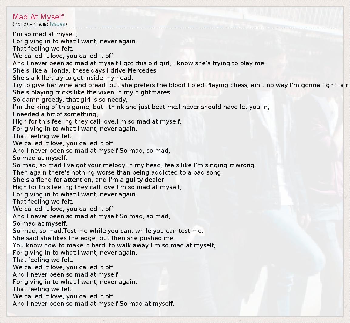 I'm so mad at myself, For giving in to what I want, never again. That feeling we felt, We called it love, you called it off And I never been so mad at myself.I got this old girl, I know she's trying to play me. She's like a Honda, these days I drive Mercedes. She's a killer, try to get inside my head, Try to give her wine and bread, but she prefers the blood I bled.Playing chess, ain't no way I'm gonna fight fair. She's playing tricks like the vixen in my nightmares. So damn greedy, that girl is so needy, I'm the king of this game, but I think she just beat me.I never should have let you in, I needed a hit of something, High for this feeling they call love.I'm so mad at myself, For giving in to what I want, never again. That feeling we felt, We called it love, you called it off And I never been so mad at myself.So mad, so mad, So mad at myself. So mad, so mad.I've got your melody in my head, feels like I'm singing it wrong. Then again there's nothing worse than being addicted to a bad song. She's a fiend for attention, and I'm a guilty dealer High for this feeling they call love.I'm so mad at myself, For giving in to what I want, never again. That feeling we felt, We called it love, you called it off And I never been so mad at myself.So mad, so mad, So mad at myself. So mad, so mad.Test me while you can, while you can test me. She said she likes the edge, but then she pushed me. You know how to make it hard, to walk away.I'm so mad at myself, For giving in to what I want, never again. That feeling we felt, We called it love, you called it off And I never been so mad at myself. For giving in to what I want, never again. That feeling we felt, We called it love, you called it off And I never been so mad at myself.So mad at myself.
