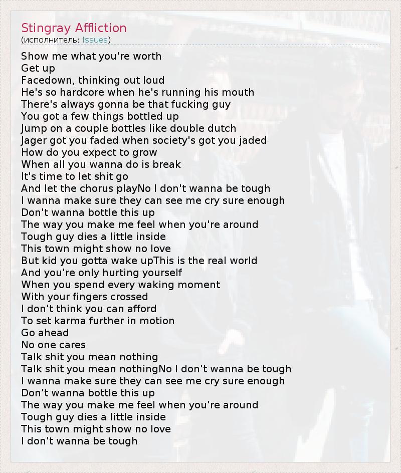 Show me what you're worth Get up Facedown, thinking out loud He's so hardcore when he's running his mouth There's always gonna be that fucking guy You got a few things bottled up Jump on a couple bottles like double dutch Jager got you faded when society's got you jaded How do you expect to grow When all you wanna do is break It's time to let shit go And let the chorus playNo I don't wanna be tough I wanna make sure they can see me cry sure enough Don't wanna bottle this up The way you make me feel when you're around Tough guy dies a little inside This town might show no love But kid you gotta wake upThis is the real world And you're only hurting yourself When you spend every waking moment With your fingers crossed I don't think you can afford To set karma further in motion Go ahead No one cares Talk shit you mean nothing Talk shit you mean nothingNo I don't wanna be tough I wanna make sure they can see me cry sure enough Don't wanna bottle this up The way you make me feel when you're around Tough guy dies a little inside This town might show no love I don't wanna be tough