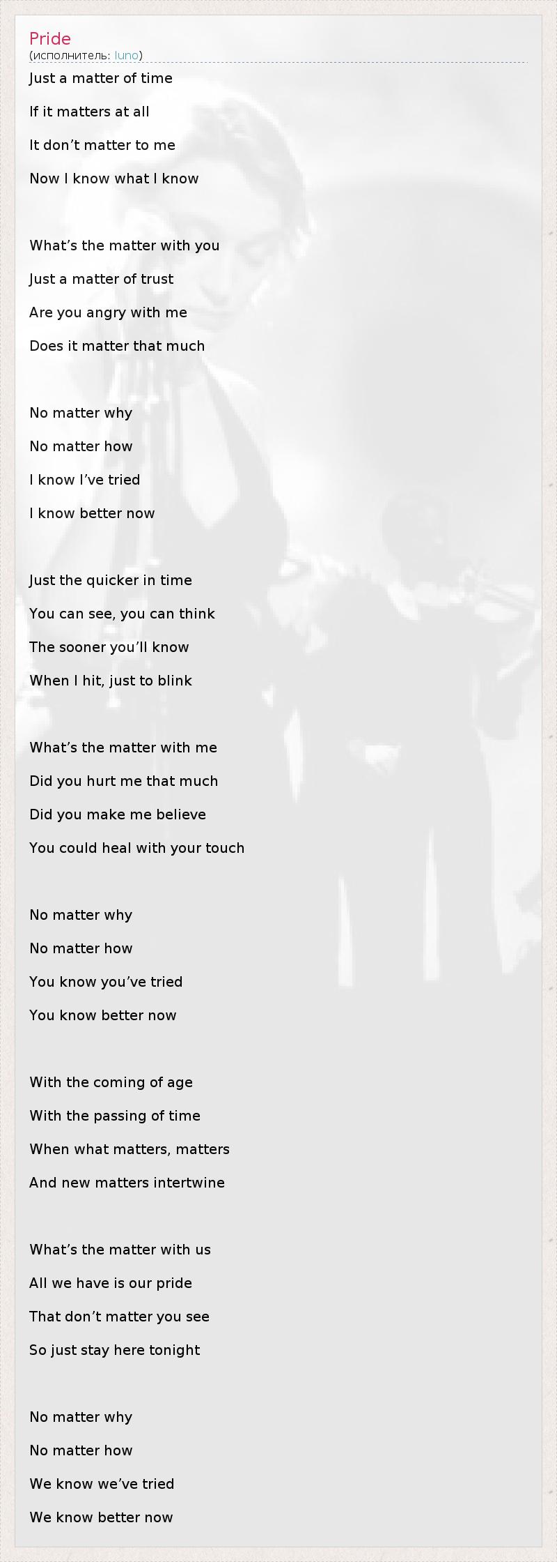 Just a matter of time If it matters at all It don’t matter to me Now I know what I know What’s the matter with you Just a matter of trust Are you angry with me Does it matter that much No matter why No matter how I know I’ve tried I know better now Just the quicker in time You can see, you can think The sooner you’ll know When I hit, just to blink What’s the matter with me Did you hurt me that much Did you make me believe You could heal with your touch No matter why No matter how You know you’ve tried You know better now With the coming of age With the passing of time When what matters, matters And new matters intertwine What’s the matter with us All we have is our pride That don’t matter you see So just stay here tonight No matter why No matter how We know we’ve tried We know better now