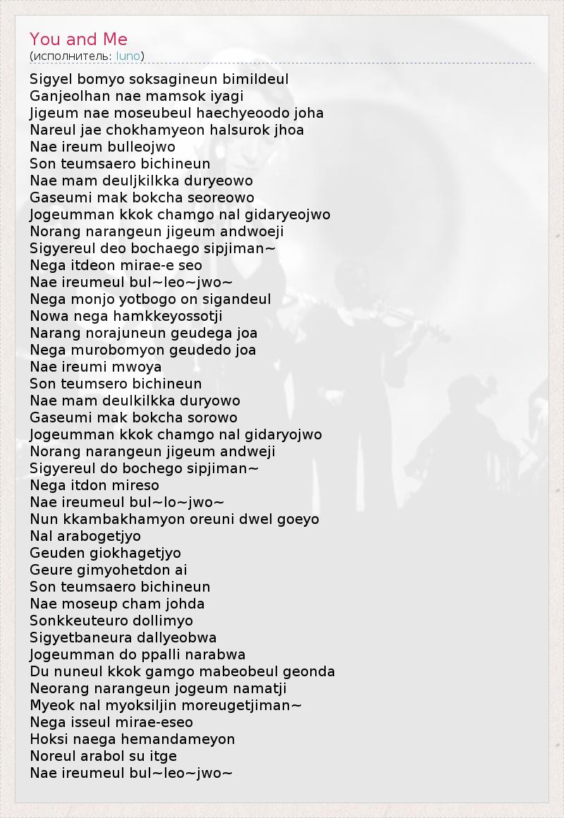 Sigyel bomyo soksagineun bimildeul Ganjeolhan nae mamsok iyagi Jigeum nae moseubeul haechyeoodo joha Nareul jae chokhamyeon halsurok jhoa Nae ireum bulleojwo Son teumsaero bichineun Nae mam deuljkilkka duryeowo Gaseumi mak bokcha seoreowo Jogeumman kkok chamgo nal gidaryeojwo Norang narangeun jigeum andwoeji Sigyereul deo bochaego sipjiman~ Nega itdeon mirae-e seo Nae ireumeul bul~leo~jwo~ Nega monjo yotbogo on sigandeul Nowa nega hamkkeyossotji Narang norajuneun geudega joa Nega murobomyon geudedo joa Nae ireumi mwoya Son teumsero bichineun Nae mam deulkilkka duryowo Gaseumi mak bokcha sorowo Jogeumman kkok chamgo nal gidaryojwo Norang narangeun jigeum andweji Sigyereul do bochego sipjiman~ Nega itdon mireso Nae ireumeul bul~lo~jwo~ Nun kkambakhamyon oreuni dwel goeyo Nal arabogetjyo Geuden giokhagetjyo Geure gimyohetdon ai Son teumsaero bichineun Nae moseup cham johda Sonkkeuteuro dollimyo Sigyetbaneura dallyeobwa Jogeumman do ppalli narabwa Du nuneul kkok gamgo mabeobeul geonda Neorang narangeun jogeum namatji Myeok nal myoksiljin moreugetjiman~ Nega isseul mirae-eseo Hoksi naega hemandameyon Noreul arabol su itge Nae ireumeul bul~leo~jwo~