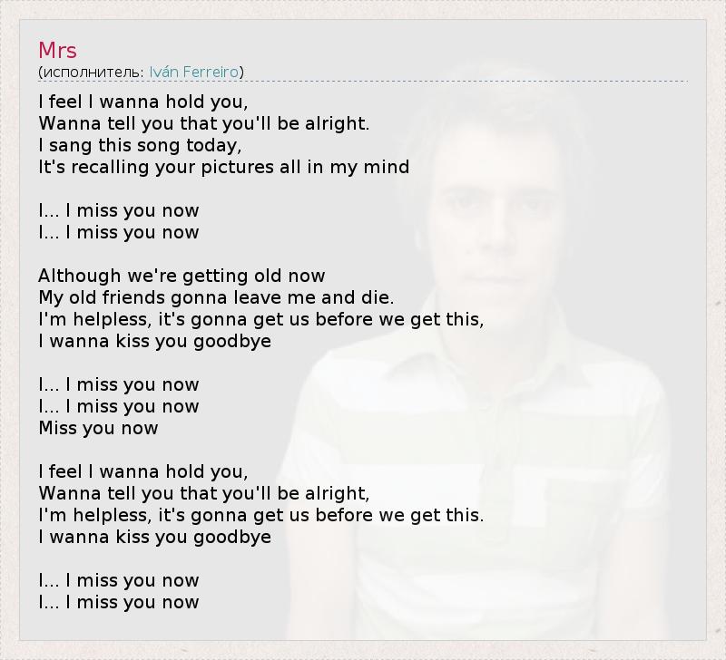 Я чувствую, что мне хочется обнять тебя, Хочется сказать, что все у тебя будет хорошо. Я пел сегодня эту песню, Она воскрешает тебя в моей памяти Я... мне тебя сейчас не хватает Я... мне тебя сейчас не хватает Мы стареем, и мои старые друзья Скоро покинут меня и умрут. Я беспомощен, это настигнет нас прежде, чем мы успеем понять, Мне хочется поцеловать тебя на прощание Я... мне тебя сейчас не хватает Я... мне тебя сейчас не хватает, Мне тебя сейчас не хватает Я чувствую, что мне хочется обнять тебя, Хочется сказать, что все у тебя будет хорошо, Я беспомощен, это настигнет нас прежде, чем мы успеем понять. Мне хочется поцеловать тебя на прощание Я... мне тебя сейчас не хватает Я... мне тебя сейчас не хватает