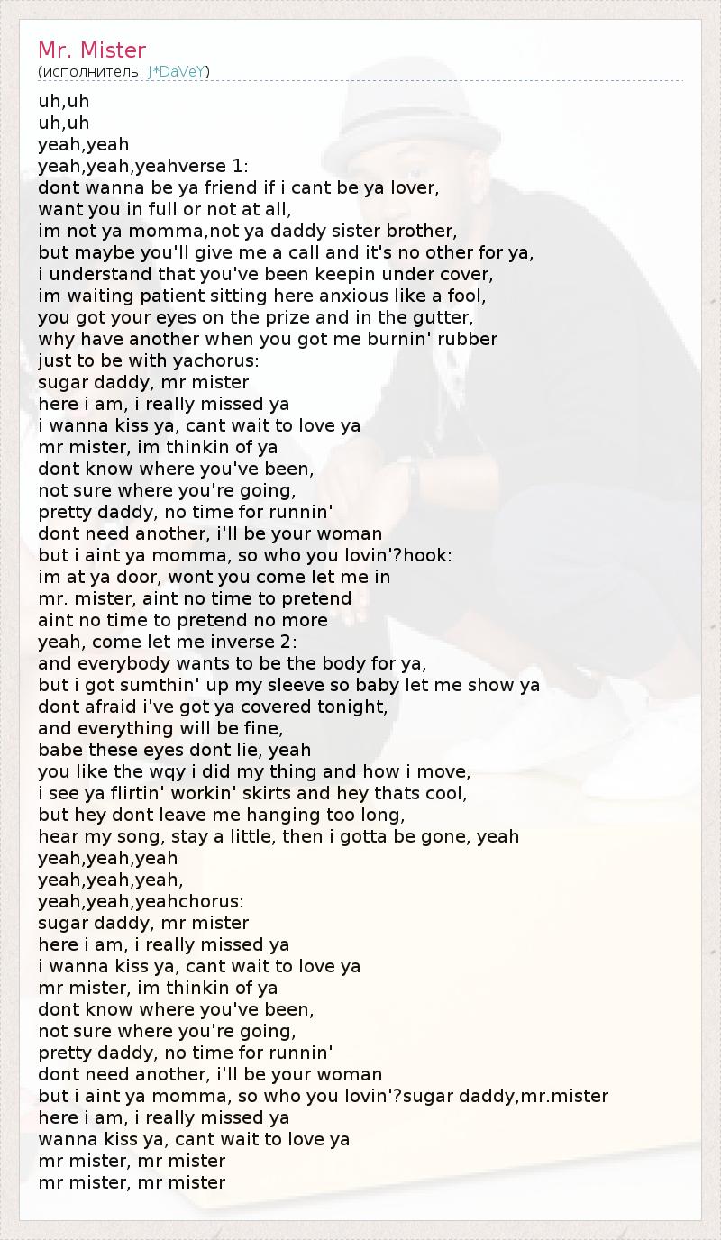 uh,uh uh,uh yeah,yeah yeah,yeah,yeahverse 1: dont wanna be ya friend if i cant be ya lover, want you in full or not at all, im not ya momma,not ya daddy sister brother, but maybe you'll give me a call and it's no other for ya, i understand that you've been keepin under cover, im waiting patient sitting here anxious like a fool, you got your eyes on the prize and in the gutter, why have another when you got me burnin' rubber just to be with yachorus: sugar daddy, mr mister here i am, i really missed ya i wanna kiss ya, cant wait to love ya mr mister, im thinkin of ya dont know where you've been, not sure where you're going, pretty daddy, no time for runnin' dont need another, i'll be your woman but i aint ya momma, so who you lovin'?hook: im at ya door, wont you come let me in mr. mister, aint no time to pretend aint no time to pretend no more yeah, come let me inverse 2: and everybody wants to be the body for ya, but i got sumthin' up my sleeve so baby let me show ya dont afraid i've got ya covered tonight, and everything will be fine, babe these eyes dont lie, yeah you like the wqy i did my thing and how i move, i see ya flirtin' workin' skirts and hey thats cool, but hey dont leave me hanging too long, hear my song, stay a little, then i gotta be gone, yeah yeah,yeah,yeah yeah,yeah,yeah, yeah,yeah,yeahchorus: sugar daddy, mr mister here i am, i really missed ya i wanna kiss ya, cant wait to love ya mr mister, im thinkin of ya dont know where you've been, not sure where you're going, pretty daddy, no time for runnin' dont need another, i'll be your woman but i aint ya momma, so who you lovin'?sugar daddy,mr.mister here i am, i really missed ya wanna kiss ya, cant wait to love ya mr mister, mr mister mr mister, mr mister