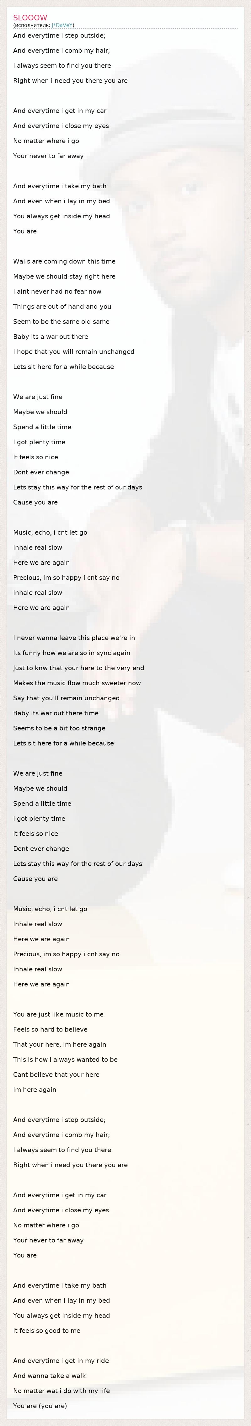 And everytime i step outside; And everytime i comb my hair; I always seem to find you there Right when i need you there you are And everytime i get in my car And everytime i close my eyes No matter where i go Your never to far away And everytime i take my bath And even when i lay in my bed You always get inside my head You are Walls are coming down this time Maybe we should stay right here I aint never had no fear now Things are out of hand and you Seem to be the same old same Baby its a war out there I hope that you will remain unchanged Lets sit here for a while because We are just fine Maybe we should Spend a little time I got plenty time It feels so nice Dont ever change Lets stay this way for the rest of our days Cause you are Music, echo, i cnt let go Inhale real slow Here we are again Precious, im so happy i cnt say no Inhale real slow Here we are again I never wanna leave this place we're in Its funny how we are so in sync again Just to knw that your here to the very end Makes the music flow much sweeter now Say that you'll remain unchanged Baby its war out there time Seems to be a bit too strange Lets sit here for a while because We are just fine Maybe we should Spend a little time I got plenty time It feels so nice Dont ever change Lets stay this way for the rest of our days Cause you are Music, echo, i cnt let go Inhale real slow Here we are again Precious, im so happy i cnt say no Inhale real slow Here we are again You are just like music to me Feels so hard to believe That your here, im here again This is how i always wanted to be Cant believe that your here Im here again And everytime i step outside; And everytime i comb my hair; I always seem to find you there Right when i need you there you are And everytime i get in my car And everytime i close my eyes No matter where i go Your never to far away You are And everytime i take my bath And even when i lay in my bed You always get inside my head It feels so good to me And everytime i get in my ride And wanna take a walk No matter wat i do with my life You are (you are)