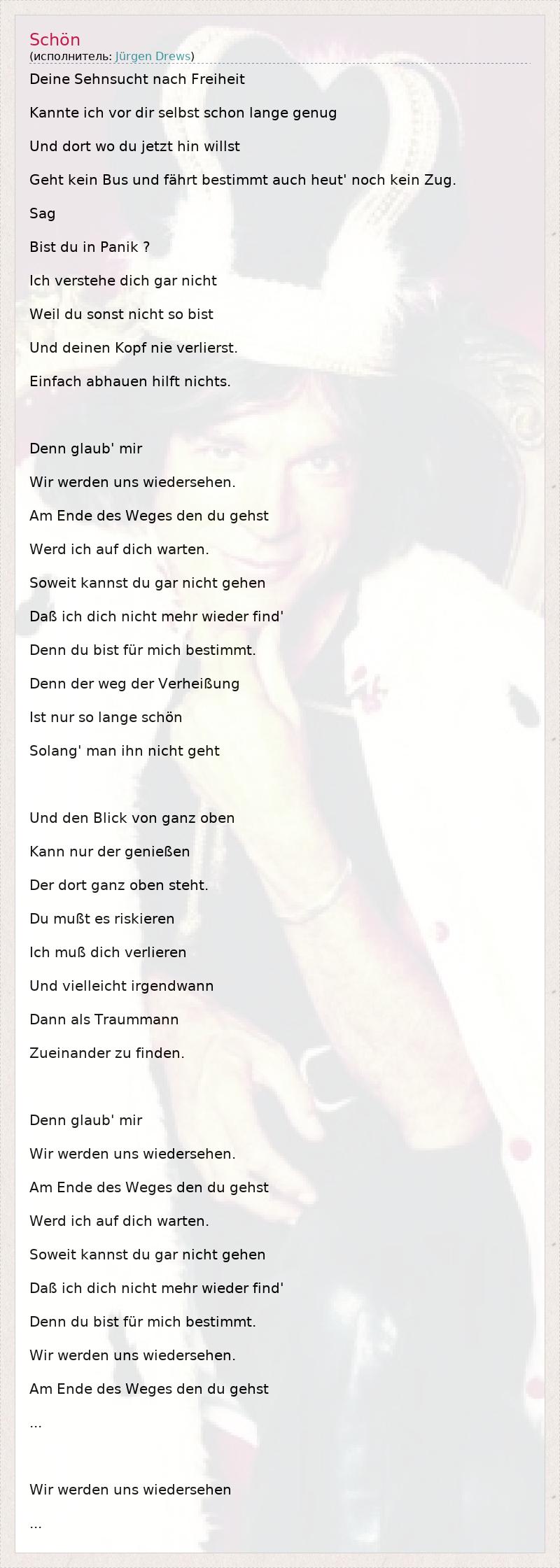Deine Sehnsucht nach Freiheit Kannte ich vor dir selbst schon lange genug Und dort wo du jetzt hin willst Geht kein Bus und fährt bestimmt auch heut' noch kein Zug. Sag Bist du in Panik ? Ich verstehe dich gar nicht Weil du sonst nicht so bist Und deinen Kopf nie verlierst. Einfach abhauen hilft nichts. Denn glaub' mir Wir werden uns wiedersehen. Am Ende des Weges den du gehst Werd ich auf dich warten. Soweit kannst du gar nicht gehen Daß ich dich nicht mehr wieder find' Denn du bist für mich bestimmt. Denn der weg der Verheißung Ist nur so lange schön Solang' man ihn nicht geht Und den Blick von ganz oben Kann nur der genießen Der dort ganz oben steht. Du mußt es riskieren Ich muß dich verlieren Und vielleicht irgendwann Dann als Traummann Zueinander zu finden. Denn glaub' mir Wir werden uns wiedersehen. Am Ende des Weges den du gehst Werd ich auf dich warten. Soweit kannst du gar nicht gehen Daß ich dich nicht mehr wieder find' Denn du bist für mich bestimmt. Wir werden uns wiedersehen. Am Ende des Weges den du gehst ... Wir werden uns wiedersehen ...