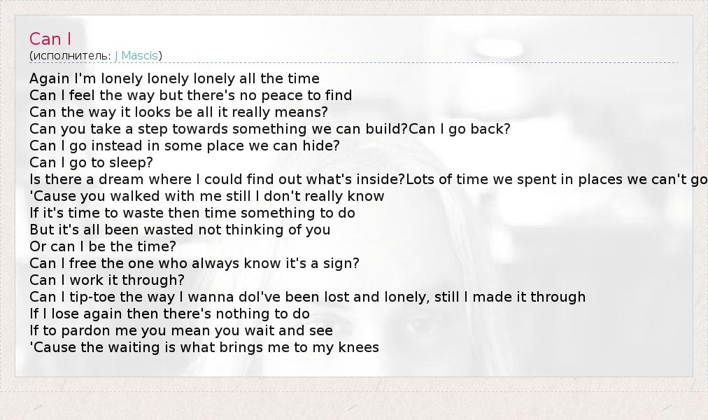 Again I'm lonely lonely lonely all the time Can I feel the way but there's no peace to find Can the way it looks be all it really means? Can you take a step towards something we can build?Can I go back? Can I go instead in some place we can hide? Can I go to sleep? Is there a dream where I could find out what's inside?Lots of time we spent in places we can't go 'Cause you walked with me still I don't really know If it's time to waste then time something to do But it's all been wasted not thinking of you Or can I be the time? Can I free the one who always know it's a sign? Can I work it through? Can I tip-toe the way I wanna doI've been lost and lonely, still I made it through If I lose again then there's nothing to do If to pardon me you mean you wait and see 'Cause the waiting is what brings me to my knees