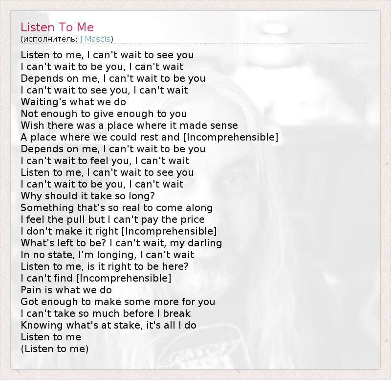 Listen to me, I can't wait to see you I can't wait to be you, I can't wait Depends on me, I can't wait to be you I can't wait to see you, I can't wait Waiting's what we do Not enough to give enough to you Wish there was a place where it made sense A place where we could rest and [Incomprehensible] Depends on me, I can't wait to be you I can't wait to feel you, I can't wait Listen to me, I can't wait to see you I can't wait to be you, I can't wait Why should it take so long? Something that's so real to come along I feel the pull but I can't pay the price I don't make it right [Incomprehensible] What's left to be? I can't wait, my darling In no state, I'm longing, I can't wait Listen to me, is it right to be here? I can't find [Incomprehensible] Pain is what we do Got enough to make some more for you I can't take so much before I break Knowing what's at stake, it's all I do Listen to me (Listen to me)