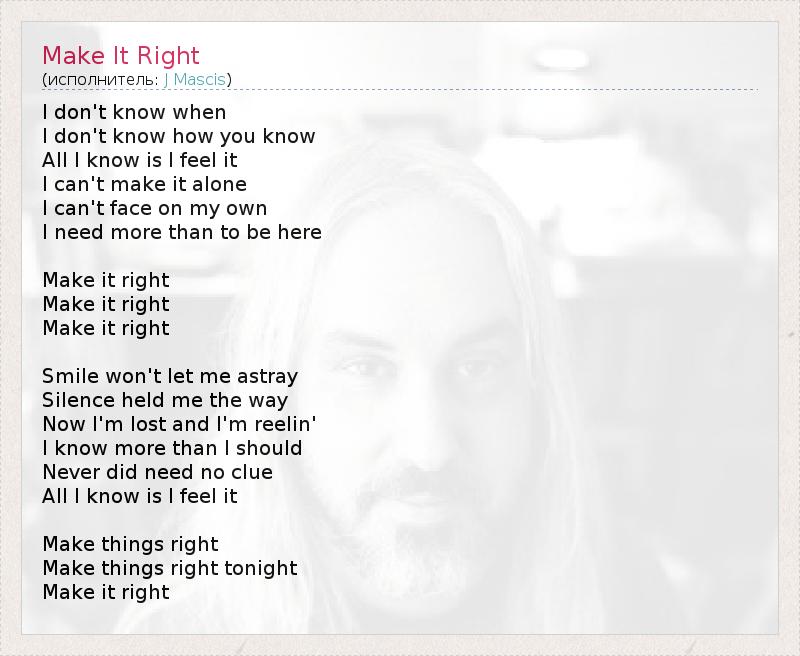 I don't know when I don't know how you know All I know is I feel it I can't make it alone I can't face on my own I need more than to be here Make it right Make it right Make it right Smile won't let me astray Silence held me the way Now I'm lost and I'm reelin' I know more than I should Never did need no clue All I know is I feel it Make things right Make things right tonight Make it right