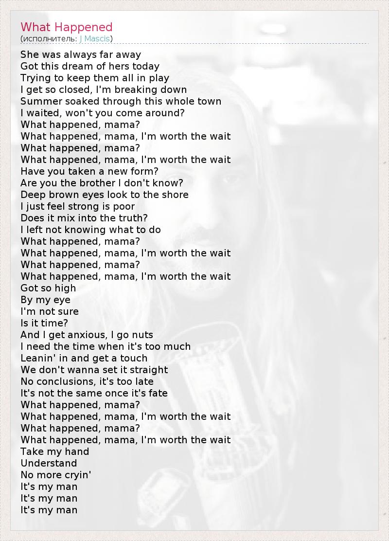 She was always far away Got this dream of hers today Trying to keep them all in play I get so closed, I'm breaking down Summer soaked through this whole town I waited, won't you come around? What happened, mama? What happened, mama, I'm worth the wait What happened, mama? What happened, mama, I'm worth the wait Have you taken a new form? Are you the brother I don't know? Deep brown eyes look to the shore I just feel strong is poor Does it mix into the truth? I left not knowing what to do What happened, mama? What happened, mama, I'm worth the wait What happened, mama? What happened, mama, I'm worth the wait Got so high By my eye I'm not sure Is it time? And I get anxious, I go nuts I need the time when it's too much Leanin' in and get a touch We don't wanna set it straight No conclusions, it's too late It's not the same once it's fate What happened, mama? What happened, mama, I'm worth the wait What happened, mama? What happened, mama, I'm worth the wait Take my hand Understand No more cryin' It's my man It's my man It's my man