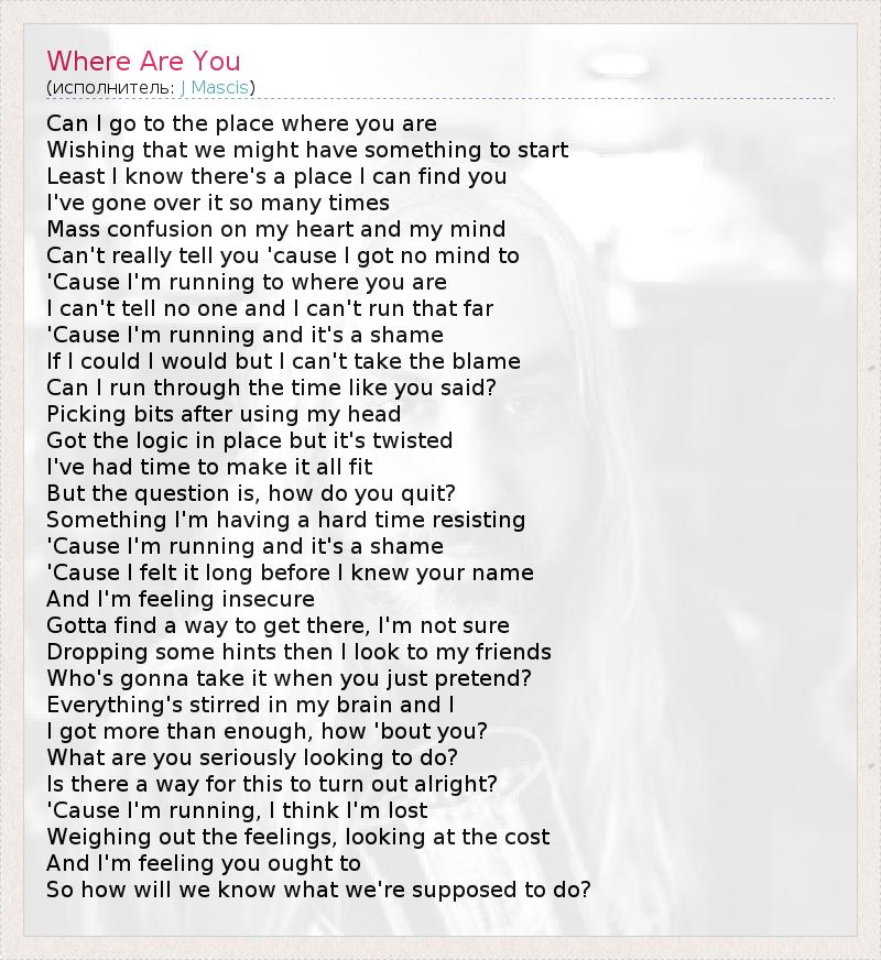 Can I go to the place where you are Wishing that we might have something to start Least I know there's a place I can find you I've gone over it so many times Mass confusion on my heart and my mind Can't really tell you 'cause I got no mind to 'Cause I'm running to where you are I can't tell no one and I can't run that far 'Cause I'm running and it's a shame If I could I would but I can't take the blame Can I run through the time like you said? Picking bits after using my head Got the logic in place but it's twisted I've had time to make it all fit But the question is, how do you quit? Something I'm having a hard time resisting 'Cause I'm running and it's a shame 'Cause I felt it long before I knew your name And I'm feeling insecure Gotta find a way to get there, I'm not sure Dropping some hints then I look to my friends Who's gonna take it when you just pretend? Everything's stirred in my brain and I I got more than enough, how 'bout you? What are you seriously looking to do? Is there a way for this to turn out alright? 'Cause I'm running, I think I'm lost Weighing out the feelings, looking at the cost And I'm feeling you ought to So how will we know what we're supposed to do?