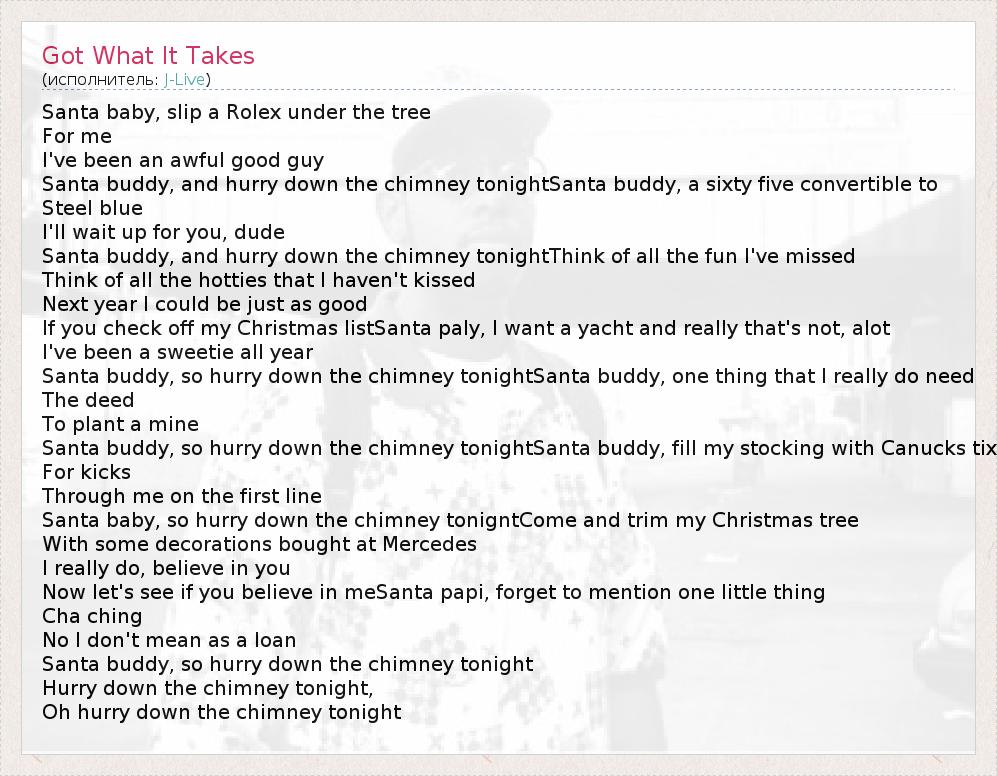 Santa baby, slip a Rolex under the tree For me I've been an awful good guy Santa buddy, and hurry down the chimney tonightSanta buddy, a sixty five convertible to Steel blue I'll wait up for you, dude Santa buddy, and hurry down the chimney tonightThink of all the fun I've missed Think of all the hotties that I haven't kissed Next year I could be just as good If you check off my Christmas listSanta paly, I want a yacht and really that's not, alot I've been a sweetie all year Santa buddy, so hurry down the chimney tonightSanta buddy, one thing that I really do need The deed To plant a mine Santa buddy, so hurry down the chimney tonightSanta buddy, fill my stocking with Canucks tix For kicks Through me on the first line Santa baby, so hurry down the chimney tonigntCome and trim my Christmas tree With some decorations bought at Mercedes I really do, believe in you Now let's see if you believe in meSanta papi, forget to mention one little thing Cha ching No I don't mean as a loan Santa buddy, so hurry down the chimney tonight Hurry down the chimney tonight, Oh hurry down the chimney tonight
