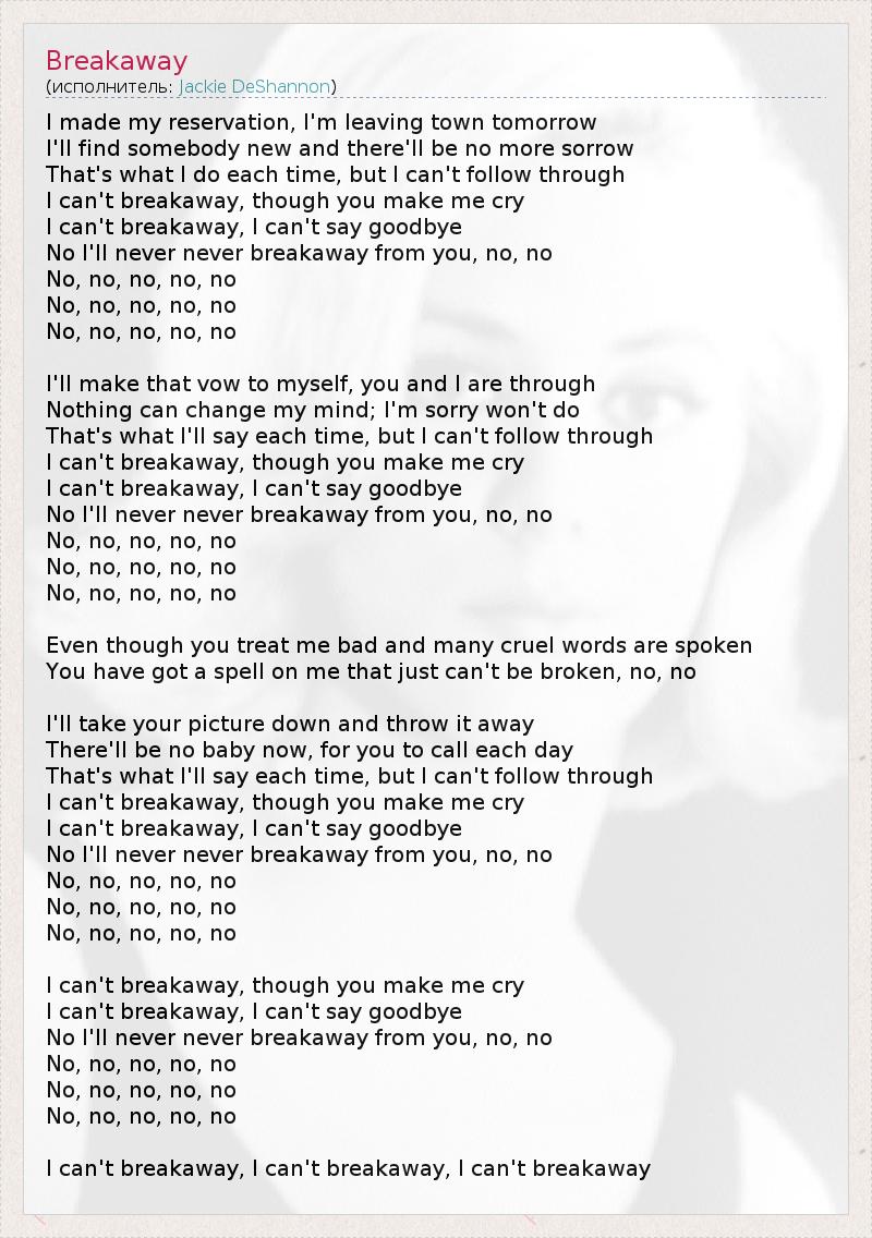 I made my reservation, I'm leaving town tomorrow I'll find somebody new and there'll be no more sorrow That's what I do each time, but I can't follow through I can't breakaway, though you make me cry I can't breakaway, I can't say goodbye No I'll never never breakaway from you, no, no No, no, no, no, no No, no, no, no, no No, no, no, no, no I'll make that vow to myself, you and I are through Nothing can change my mind; I'm sorry won't do That's what I'll say each time, but I can't follow through I can't breakaway, though you make me cry I can't breakaway, I can't say goodbye No I'll never never breakaway from you, no, no No, no, no, no, no No, no, no, no, no No, no, no, no, no Even though you treat me bad and many cruel words are spoken You have got a spell on me that just can't be broken, no, no I'll take your picture down and throw it away There'll be no baby now, for you to call each day That's what I'll say each time, but I can't follow through I can't breakaway, though you make me cry I can't breakaway, I can't say goodbye No I'll never never breakaway from you, no, no No, no, no, no, no No, no, no, no, no No, no, no, no, no I can't breakaway, though you make me cry I can't breakaway, I can't say goodbye No I'll never never breakaway from you, no, no No, no, no, no, no No, no, no, no, no No, no, no, no, no I can't breakaway, I can't breakaway, I can't breakaway