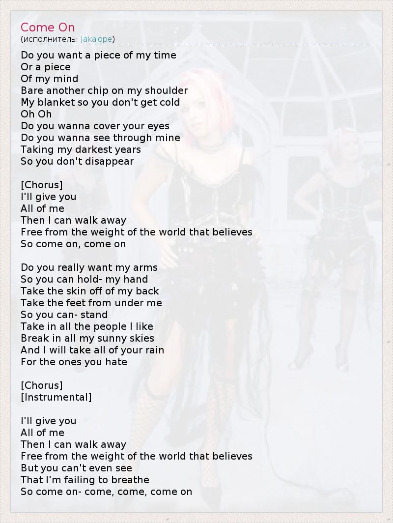 Do you want a piece of my time Or a piece Of my mind Bare another chip on my shoulder My blanket so you don't get cold Oh Oh Do you wanna cover your eyes Do you wanna see through mine Taking my darkest years So you don't disappear [Chorus] I'll give you All of me Then I can walk away Free from the weight of the world that believes So come on, come on Do you really want my arms So you can hold- my hand Take the skin off of my back Take the feet from under me So you can- stand Take in all the people I like Break in all my sunny skies And I will take all of your rain For the ones you hate [Chorus] [Instrumental] I'll give you All of me Then I can walk away Free from the weight of the world that believes But you can't even see That I'm failing to breathe So come on- come, come, come on