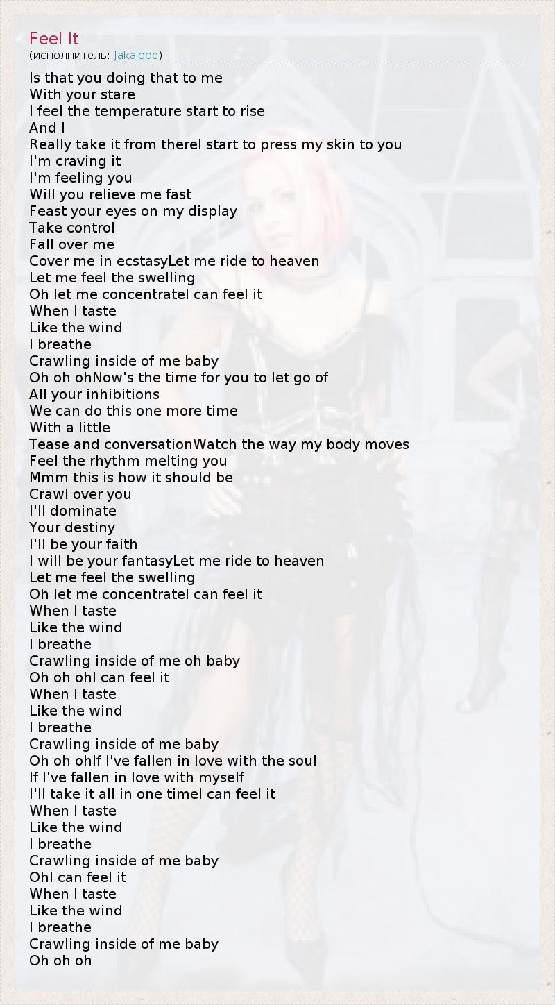 Is that you doing that to me With your stare I feel the temperature start to rise And I Really take it from thereI start to press my skin to you I'm craving it I'm feeling you Will you relieve me fast Feast your eyes on my display Take control Fall over me Cover me in ecstasyLet me ride to heaven Let me feel the swelling Oh let me concentrateI can feel it When I taste Like the wind I breathe Crawling inside of me baby Oh oh ohNow's the time for you to let go of All your inhibitions We can do this one more time With a little Tease and conversationWatch the way my body moves Feel the rhythm melting you Mmm this is how it should be Crawl over you I'll dominate Your destiny I'll be your faith I will be your fantasyLet me ride to heaven Let me feel the swelling Oh let me concentrateI can feel it When I taste Like the wind I breathe Crawling inside of me oh baby Oh oh ohI can feel it When I taste Like the wind I breathe Crawling inside of me baby Oh oh ohIf I've fallen in love with the soul If I've fallen in love with myself I'll take it all in one timeI can feel it When I taste Like the wind I breathe Crawling inside of me baby OhI can feel it When I taste Like the wind I breathe Crawling inside of me baby Oh oh oh