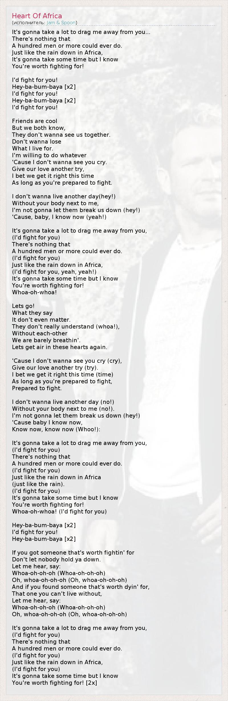 It's gonna take a lot to drag me away from you... There's nothing that A hundred men or more could ever do. Just like the rain down in Africa, It's gonna take some time but I know You're worth fighting for! I'd fight for you! Hey-ba-bum-baya [x2] I'd fight for you! Hey-ba-bum-baya [x2] I'd fight for you! Friends are cool But we both know, They don't wanna see us together. Don't wanna lose What I live for. I'm willing to do whatever 'Cause I don't wanna see you cry. Give our love another try, I bet we get it right this time As long as you're prepared to fight. I don't wanna live another day(hey!) Without your body next to me, I'm not gonna let them break us down (hey!) 'Cause, baby, I know now (yeah!) It's gonna take a lot to drag me away from you, (I'd fight for you) There's nothing that A hundred men or more could ever do. (I'd fight for you) Just like the rain down in Africa, (I'd fight for you, yeah, yeah!) It's gonna take some time but I know You're worth fighting for! Whoa-oh-whoa! Lets go! What they say It don't even matter. They don't really understand (whoa!), Without each-other We are barely breathin'. Lets get air in these hearts again. 'Cause I don't wanna see you cry (cry), Give our love another try (try). I bet we get it right this time (time) As long as you're prepared to fight, Prepared to fight. I don't wanna live another day (no!) Without your body next to me (no!). I'm not gonna let them break us down (hey!) 'Cause baby I know now, Know now, know now (Whoo!): It's gonna take a lot to drag me away from you, (I'd fight for you) There's nothing that A hundred men or more could ever do. (I'd fight for you) Just like the rain down in Africa (just like the rain). (I'd fight for you) It's gonna take some time but I know You're worth fighting for! Whoa-oh-whoa! (I'd fight for you) Hey-ba-bum-baya [x2] I'd fight for you! Hey-ba-bum-baya [x2] If you got someone that's worth fightin' for Don't let nobody hold ya down. Let me hear, say: Whoa-oh-oh-oh (Whoa-oh-oh-oh) Oh, whoa-oh-oh-oh (Oh, whoa-oh-oh-oh) And if you found someone that's worth dyin' for, That one you can't live without, Let me hear, say: Whoa-oh-oh-oh (Whoa-oh-oh-oh) Oh, whoa-oh-oh-oh (Oh, whoa-oh-oh-oh) It's gonna take a lot to drag me away from you, (I'd fight for you) There's nothing that A hundred men or more could ever do. (I'd fight for you) Just like the rain down in Africa, (I'd fight for you) It's gonna take some time but I know You're worth fighting for! [2x]