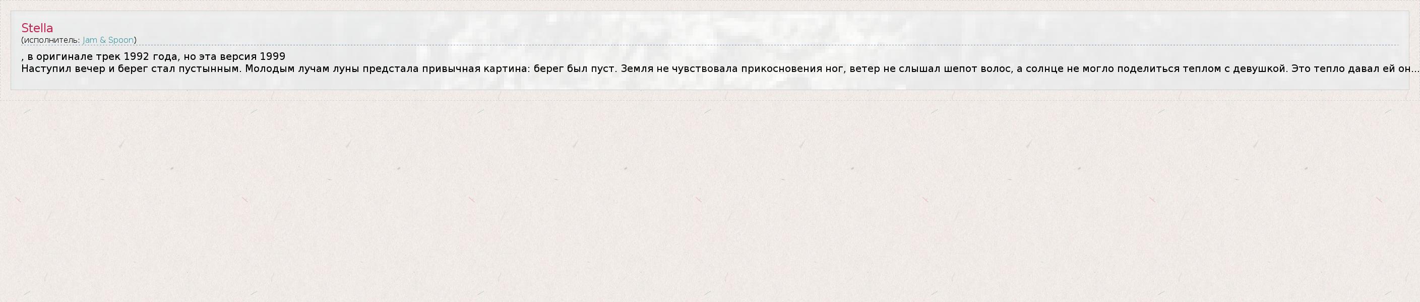 Это интересно:Немецкий электронный проект Jam & Spoon состоялся в 1991 году, когда два талантливых музыканта Jam El Mar (Rolf Ellmer) и Mark Spoon (Markus Loffel) решили объединить свои усилия в написании музыки. К тому времени у каждого из них был достаточно солидный опыт в шоу-бизнесе. Jam El Mar уже прославился как ремиксер и со-продюсер тренс проекта Dance 2 Trance, а Mark Spoon успел поработать с Turbo B и Moses P. В 1993 году вышел самый известный... продолжение