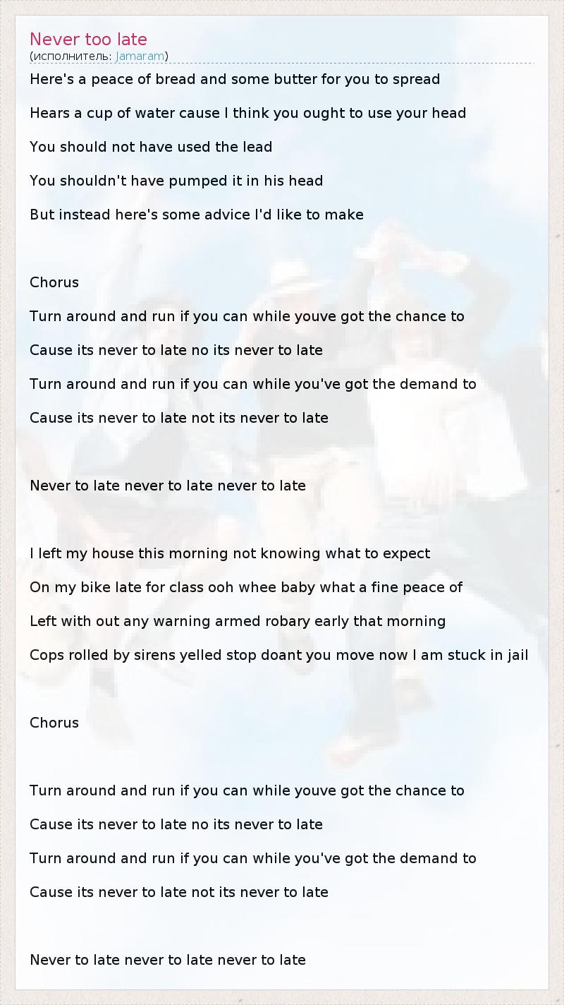 Here's a peace of bread and some butter for you to spread Hears a cup of water cause I think you ought to use your head You should not have used the lead You shouldn't have pumped it in his head But instead here's some advice I'd like to make Chorus Turn around and run if you can while youve got the chance to Cause its never to late no its never to late Turn around and run if you can while you've got the demand to Cause its never to late not its never to late Never to late never to late never to late I left my house this morning not knowing what to expect On my bike late for class ooh whee baby what a fine peace of Left with out any warning armed robary early that morning Cops rolled by sirens yelled stop doant you move now I am stuck in jail Chorus Turn around and run if you can while youve got the chance to Cause its never to late no its never to late Turn around and run if you can while you've got the demand to Cause its never to late not its never to late Never to late never to late never to late