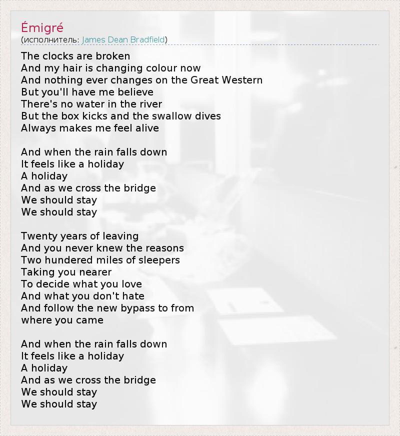 The clocks are broken And my hair is changing colour now And nothing ever changes on the Great Western But you'll have me believe There's no water in the river But the box kicks and the swallow dives Always makes me feel alive And when the rain falls down It feels like a holiday A holiday And as we cross the bridge We should stay We should stay Twenty years of leaving And you never knew the reasons Two hundered miles of sleepers Taking you nearer To decide what you love And what you don't hate And follow the new bypass to from where you came And when the rain falls down It feels like a holiday A holiday And as we cross the bridge We should stay We should stay