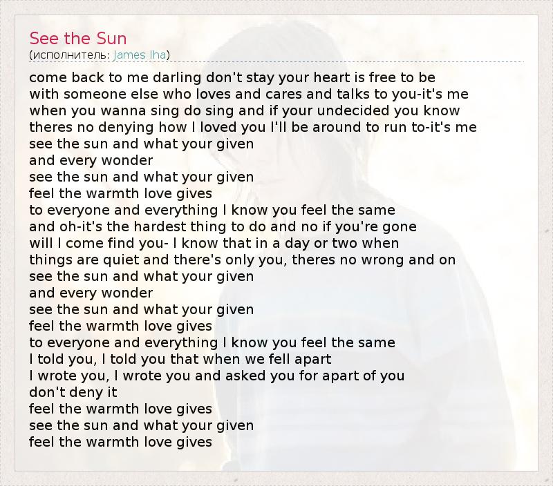 come back to me darling don't stay your heart is free to be with someone else who loves and cares and talks to you-it's me when you wanna sing do sing and if your undecided you know theres no denying how I loved you I'll be around to run to-it's me see the sun and what your given and every wonder see the sun and what your given feel the warmth love gives to everyone and everything I know you feel the same and oh-it's the hardest thing to do and no if you're gone will I come find you- I know that in a day or two when things are quiet and there's only you, theres no wrong and on see the sun and what your given and every wonder see the sun and what your given feel the warmth love gives to everyone and everything I know you feel the same I told you, I told you that when we fell apart I wrote you, I wrote you and asked you for apart of you don't deny it feel the warmth love gives see the sun and what your given feel the warmth love gives